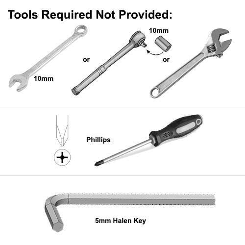 • Tools required not provided: 10mm Ratchet, 5mm Halen Key, Phillips Screwdriver.