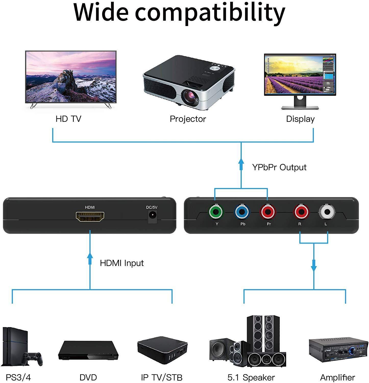 . HDMI(input) to YPbPr (output) 1080p scaler compatible with the Nintendo Switch/ Laptop /PS3 /PS4 /PS4 Pro /Apple TV /Roku /Amazon Fire TV /Blu-Ray DVD /HD Projectors /Xbox 360 /Xbox One /DVB receiver/Game Console etc. Supports uncompressed 2 channel audio such as LPCM.