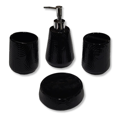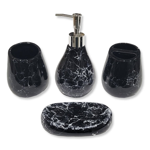 Set with 4 essential bathroom accessories. They are made of ceramic and are easy to clean in addition to giving an elegant look to your bathroom. . 4-piece set includes: A tumbler, a toothbrush holder, a soap dish and a soap dispenser . Made of ceramic . Smooth surface easy to clean . Black marble pattern