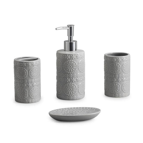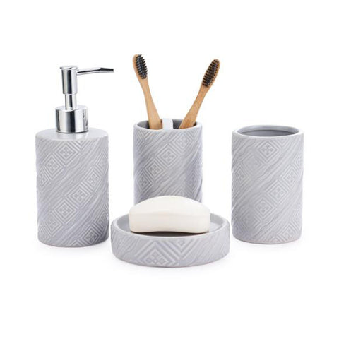 Add a touch of modern appeal to the powder room and master bath with this clean-lined 4-piece bathroom accessory set . Grey color . Includes: A soap dispenser, a tumbler, a toothbrush holder and a soap dish . Made of ceramic