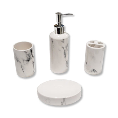 Set with 4 essential bathroom accessories. They are made of ceramic and are easy to clean in addition to giving an elegant look to your bathroom. . 4-piece set includes: A tumbler, a toothbrush holder, a soap dish and a soap dispenser . Made of ceramic . Smooth surface easy to clean . White marble pattern