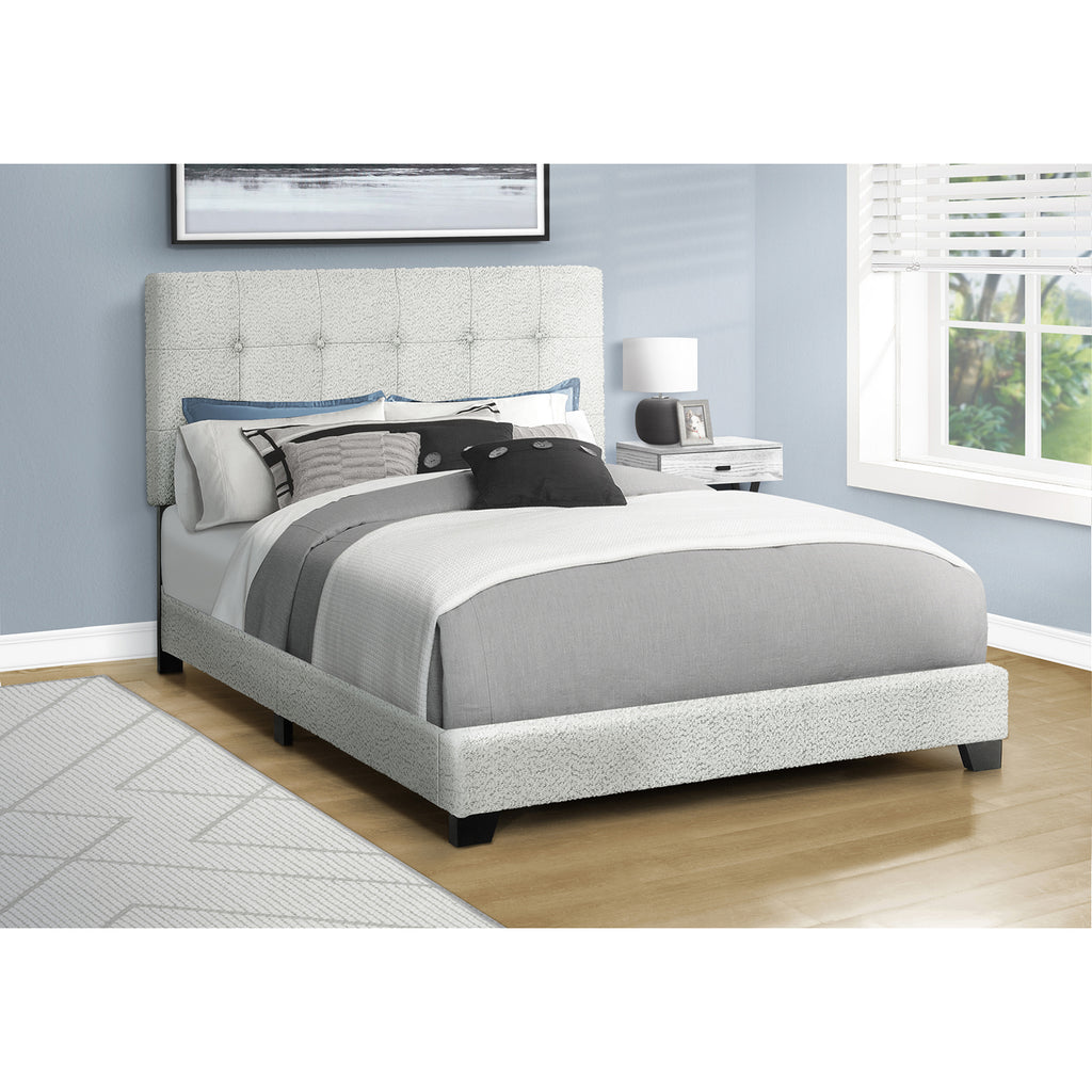 Transform your bedroom into a sanctuary of comfort and style with this Monarch Specialties full size bed frame. Upholstered in light grey bouclé fabric and supported by black plastic legs, this bed is the perfect combination of transitional style and functionality. Its elegantly button-tufted headboard provides ample support for leaning back. Crafted from solid engineered wood, this bed frame features a sturdy and durable frame with wood slats for optimal support of a standard-size box spring and mattress (not included). Its modern low profile fits perfectly in contemporary and cozy bedrooms.