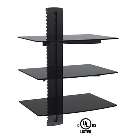 Wall mount shelves for audio / video components such as a DVD player, Blu-Ray player, Video Game Console, Satellite box, cable box or other. Supports up to 17.6 Lbs or 8 Kg. per shelf Each shelf are 38 x 28cm (15 x 11 inches) 3 tempered glass shelves black (Can't see thru) 5mm thick Black Pillar lenght: 58 cm (22.83 Inches) Cables Organizer...