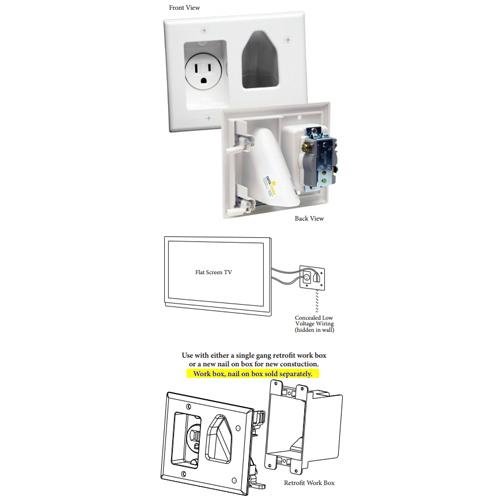 The Recessed Low Voltage Media Plate offer the convenience of a power outlet and a recessed plate with enough room to store the low voltage cables behind your flat panel TV.