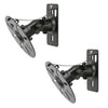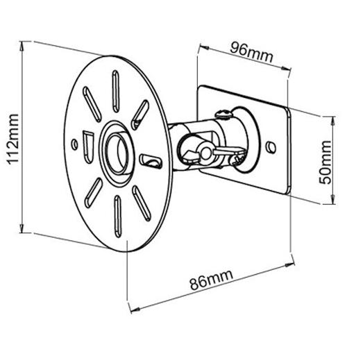 Mounts for home theater medium speakers. Articulated mount, tilt and swivel. 86mm from the wall and supports 15kg or 33lbs. Wall plate dimensions: 3.75in x 2in (96mm x 50mm). Head dimensions: 4.4in x 4.4in (112mm x 112mm). All metal with safety cable.