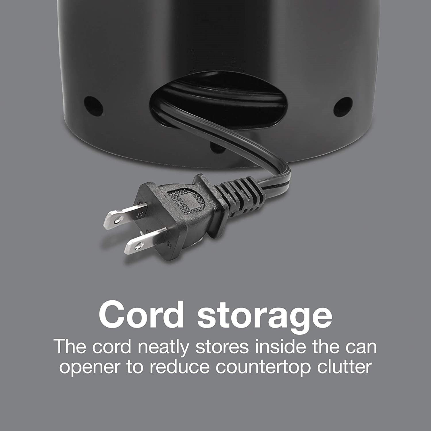 The cord stores neatly inside the base of the can opener to reduce countertop clutter.