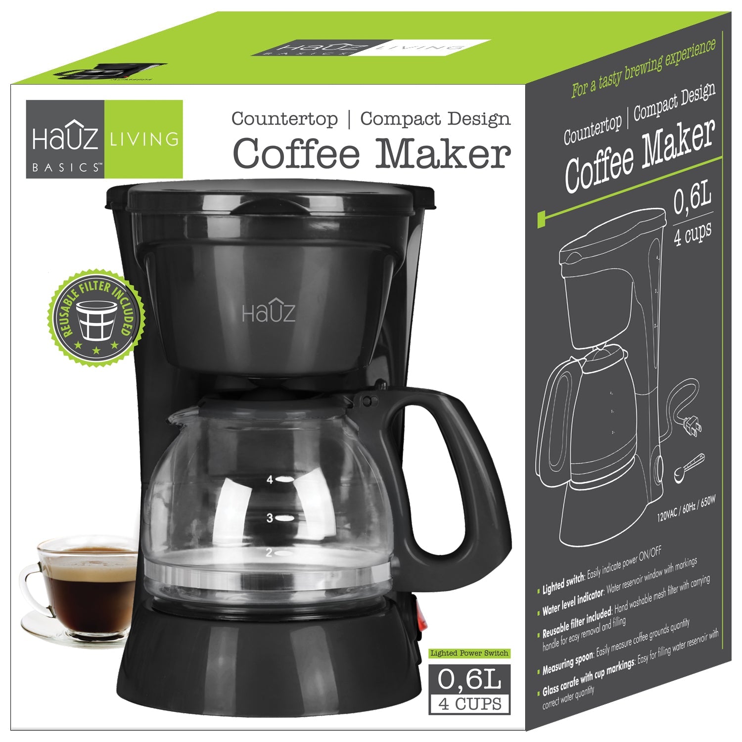 Hauz - 4 Cup Coffee Maker, Compact Design, Reusable Filter, BlackItem: 80-ACM4604
