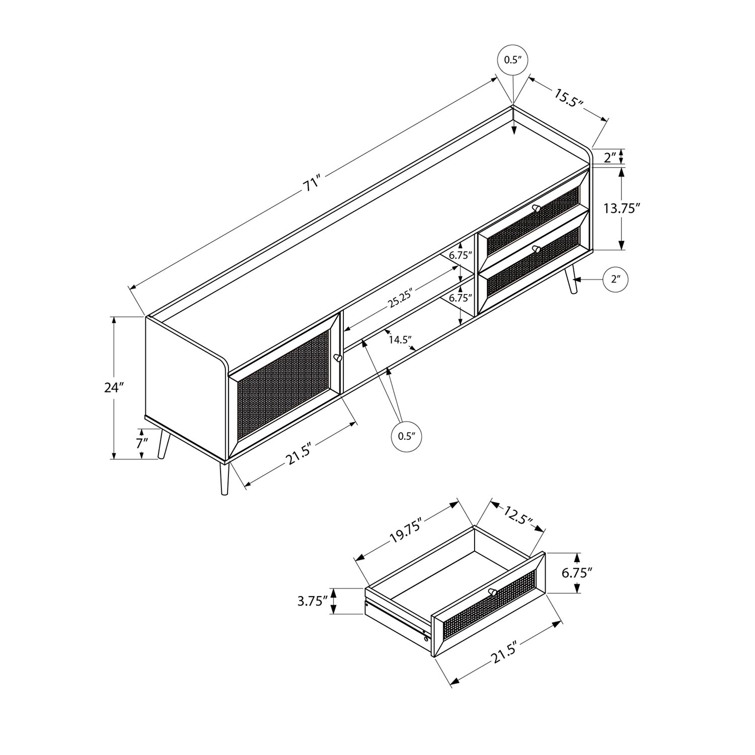 - This multimedia entertainment center includes 1 closed storage unit and 2 drawers with elegant rattan panels and wooden knobs, for storing multimedia accessories.