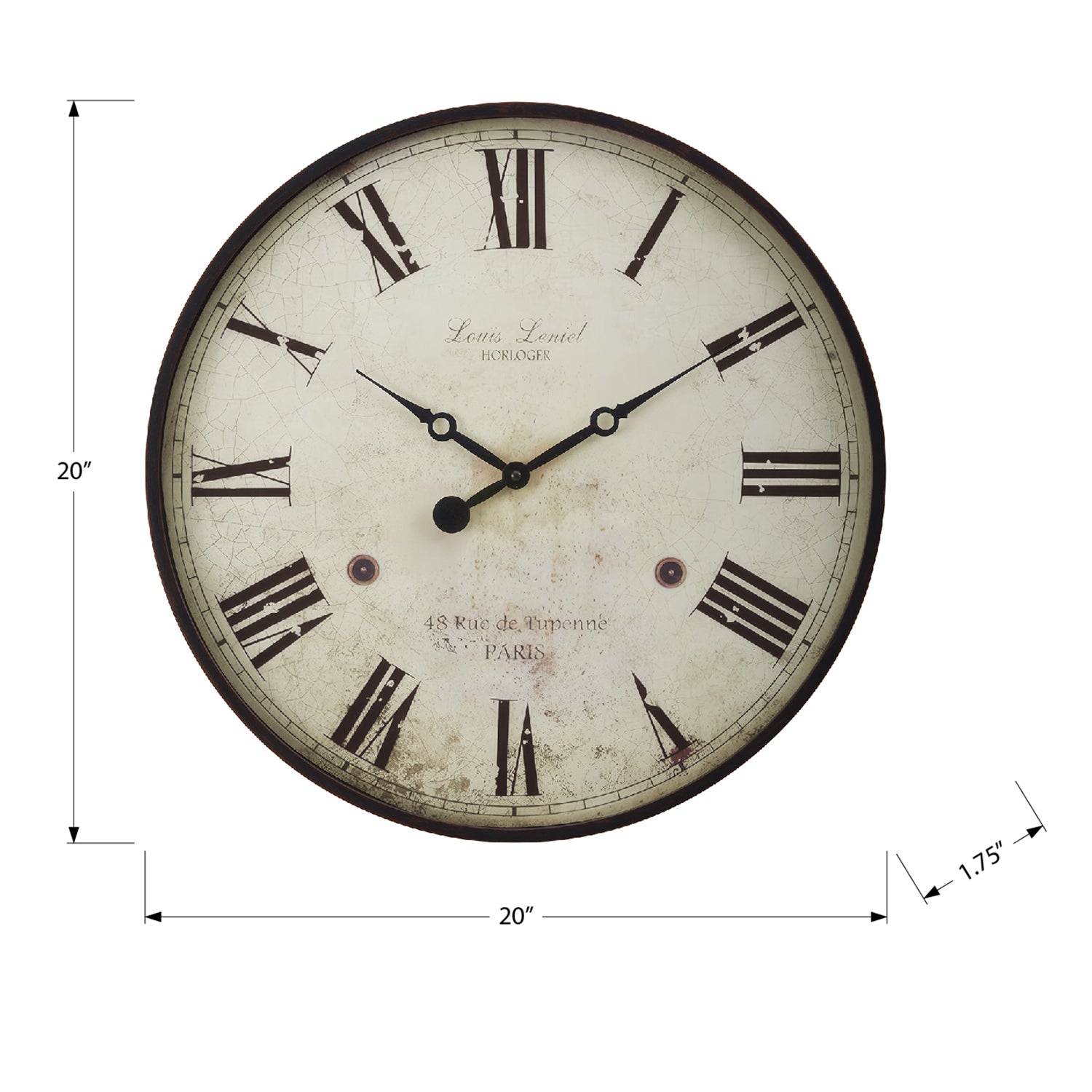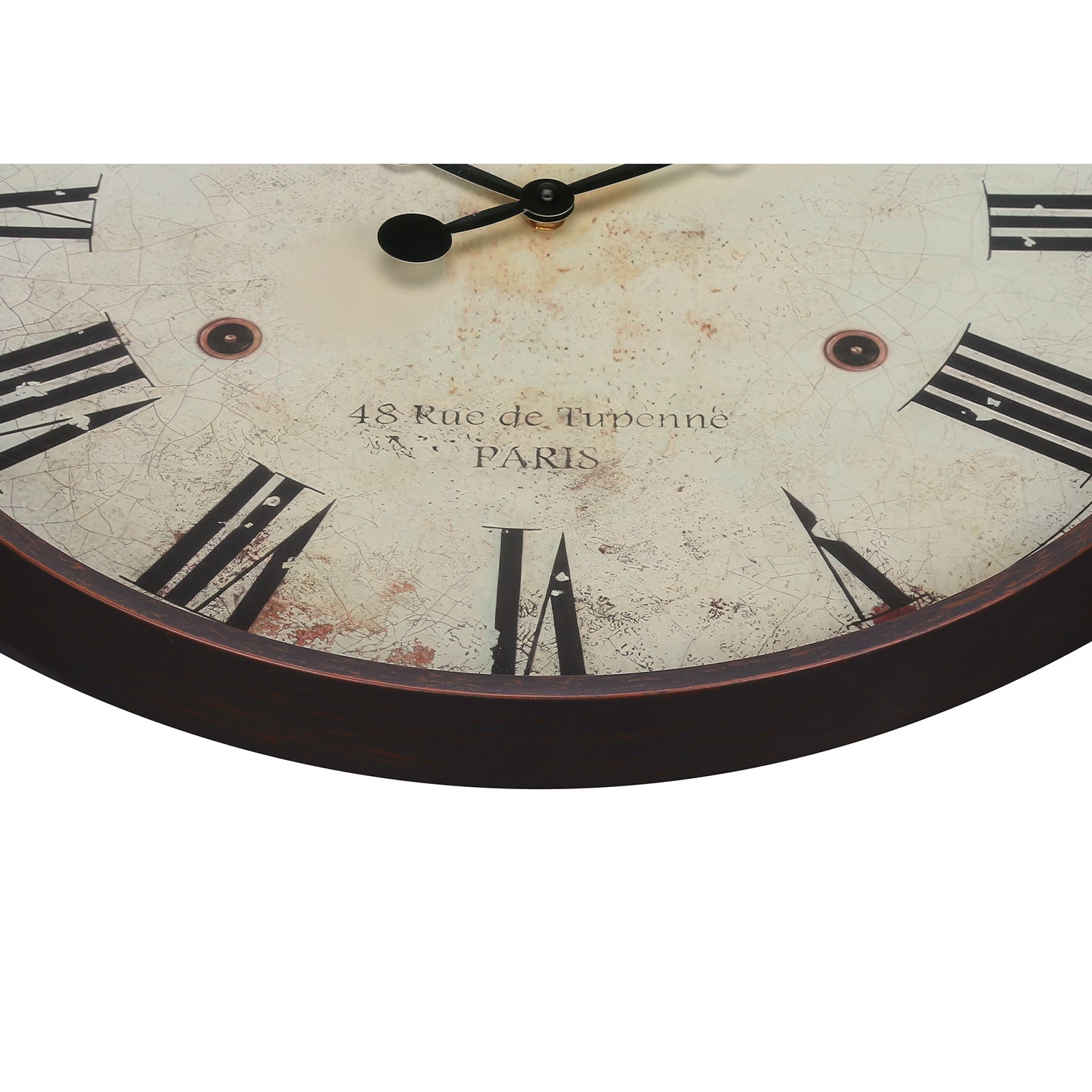 Bring a touch of classic charm to your home with this 20-inch round wall clock in antique brown. Its elegant design combines functionality and aesthetics, transforming any wall into a decorative work of art. Featuring a durable plastic frame and clear glass surface, this clock is built to last. The imposing Roman numerals and analog display, on a distressed background, add an antique and refined look, perfect for transitional decor. The quartz movement ensures impeccable time accuracy, while the silent function makes this clock the ideal choice for quiet spaces, such as bedrooms or living rooms.