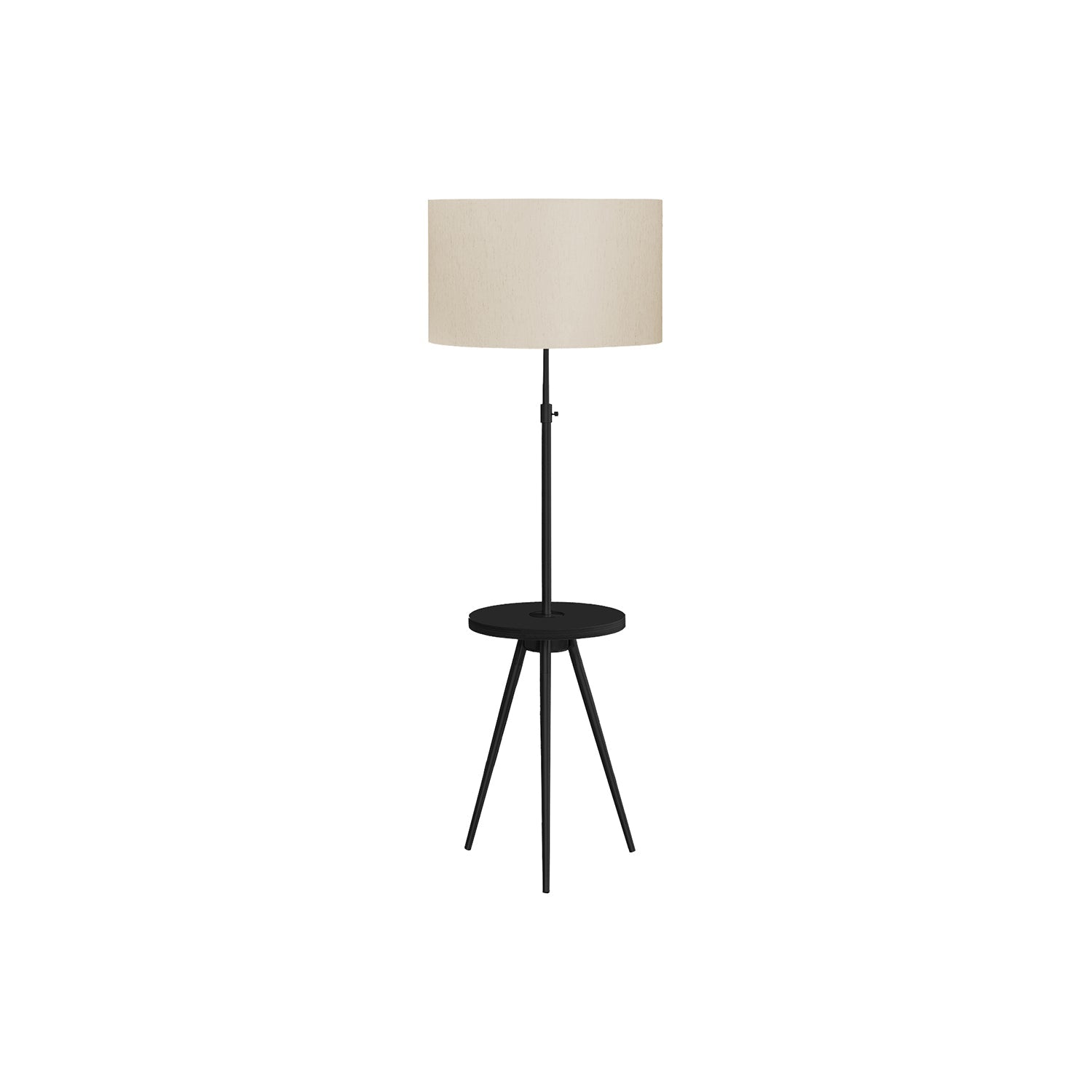 Add a touch of elegance to your home with this 66-inch black metal tripod floor lamp, featuring a built-in black laminate shelf and an ivory linen drum shade. Perfect for living rooms, bedrooms or offices, this modern fixture offers an adjustable stand to customize the height to suit your lighting needs. It accommodates a three-phase bulb up to 150W (not included) with a three-way switch, allowing you to adjust the light intensity to create the perfect ambiance. The convenient built-in shelf is perfect for keeping a drink or phone within reach. Easy to assemble with clear instructions, this floor lamp includes a 2-year limited warranty for peace of mind. This decorative and contemporary fixture will quickly become a centerpiece of your home decor.
