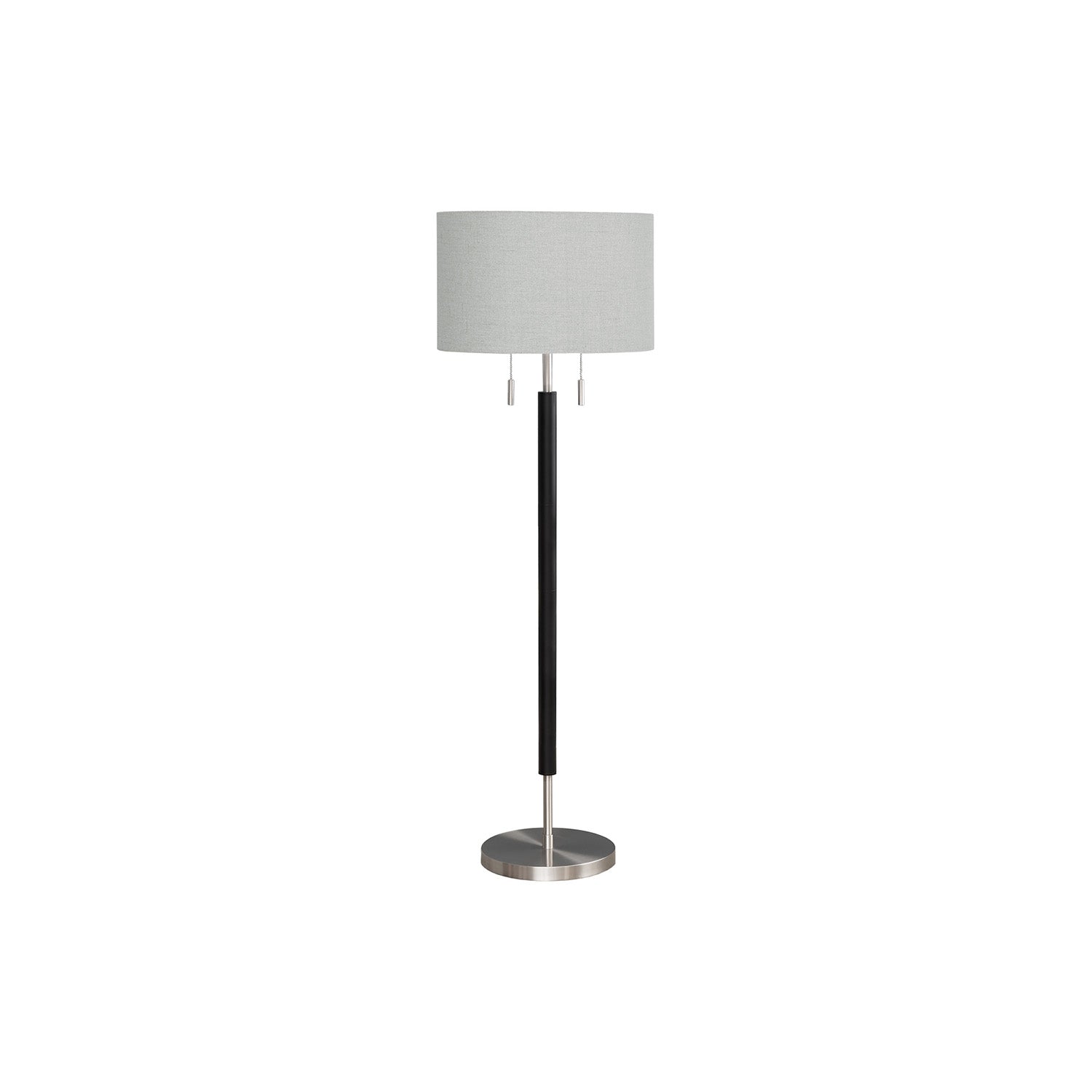 Bring a touch of modernity and sophistication to your home with our 60-inch tall black and silver metal floor lamp. Perfect for the living room, bedroom or office, this sleek fixture is topped with a drum grey fabric shade, adding a touch of chic to any room. Featuring two sockets that can each accommodate a 60W bulb (not included), it offers a powerful and flexible lighting solution. With a dual pull chain switch, you can easily adjust the brightness to create the desired ambiance, whether it's for direct lighting or a more subdued atmosphere. Assembly is quick and easy, allowing you to enjoy this elegant lighting right away. A 2-year limited warranty gives you peace of mind, while this contemporary design illuminates with style and efficiency.