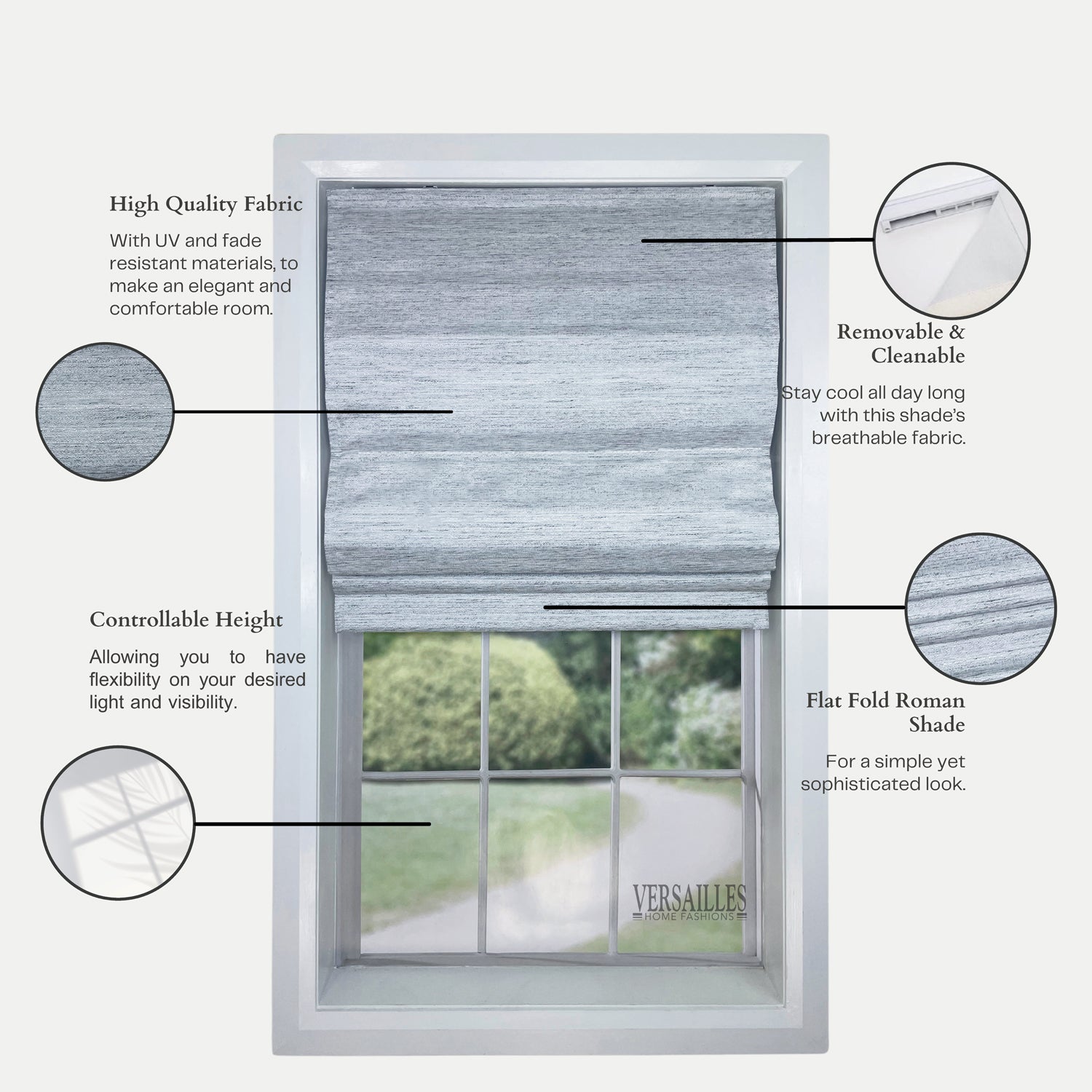 Versaille - Cordless Roman Shade, Caesar Collection, Room Darkening Fabric, Light Grey (Available in 7 Sizes)