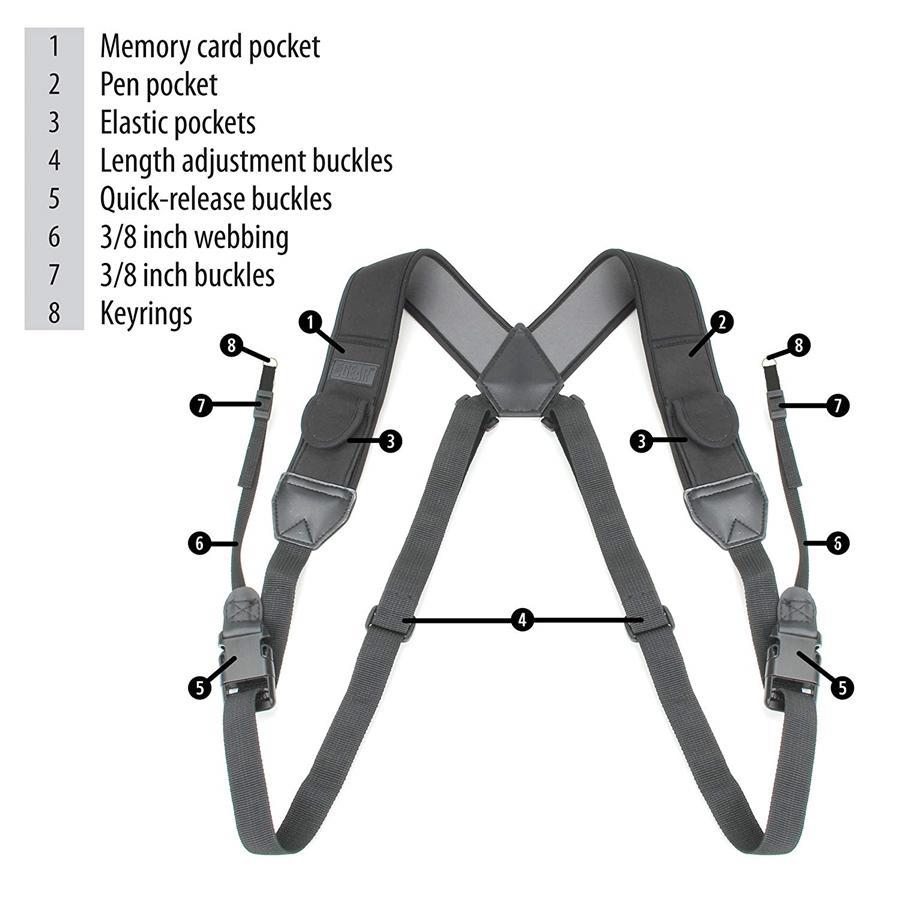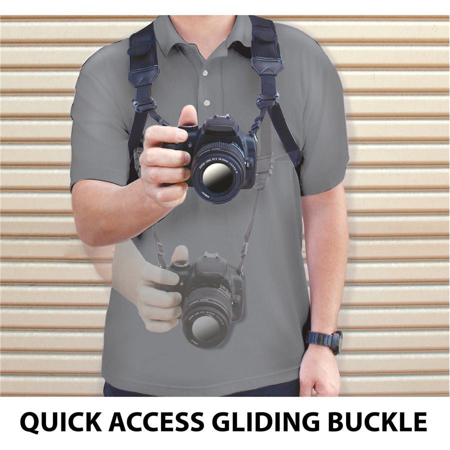 . The harness provides even weight distribution across both shoulders so you can carry even the heaviest of cameras with ease.