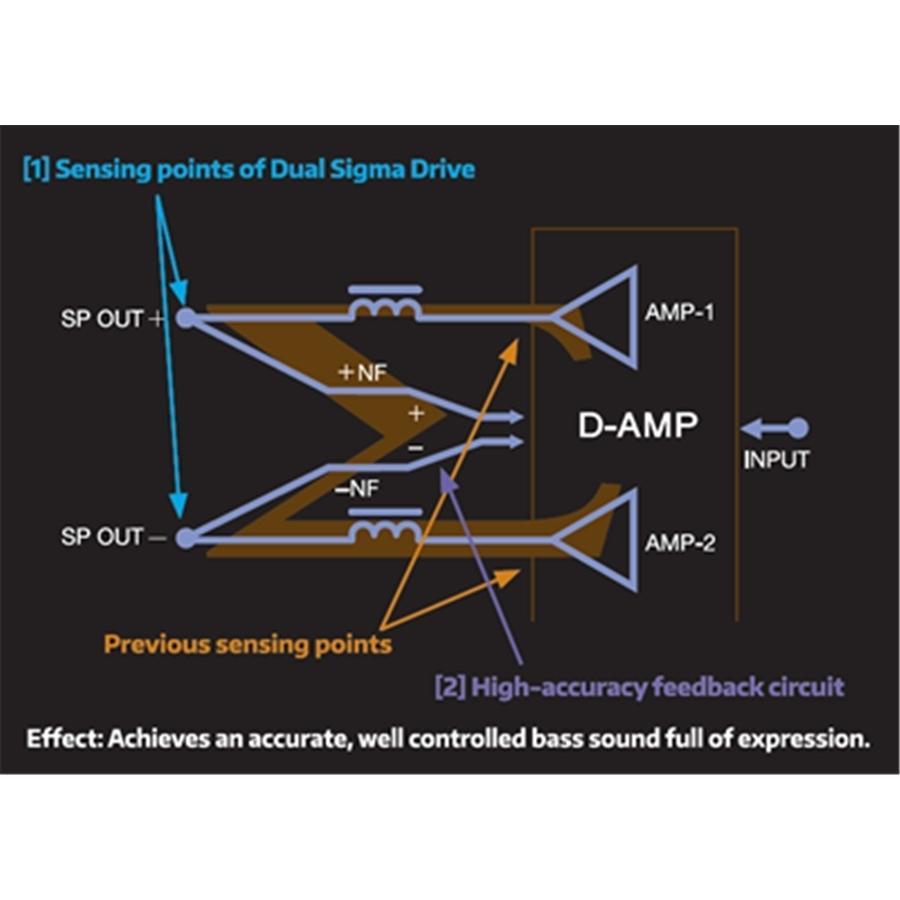 .Dual Sigma Drive This advanced negative feedback circuit improves damping factor and increases accuracy and sound quality. When a signal is passed to a subwoofer, like a 50Hz note, the speaker will move and create the note. However, because the speaker has mass and a suspension, it won't stop moving once it's in motion. This extra movement (sound) creates a type of distortion that's not part of the original signal. The negative feedback circuit senses this unwanted movement and sends out an opposite pulse to stop the speaker like an electronic brake.