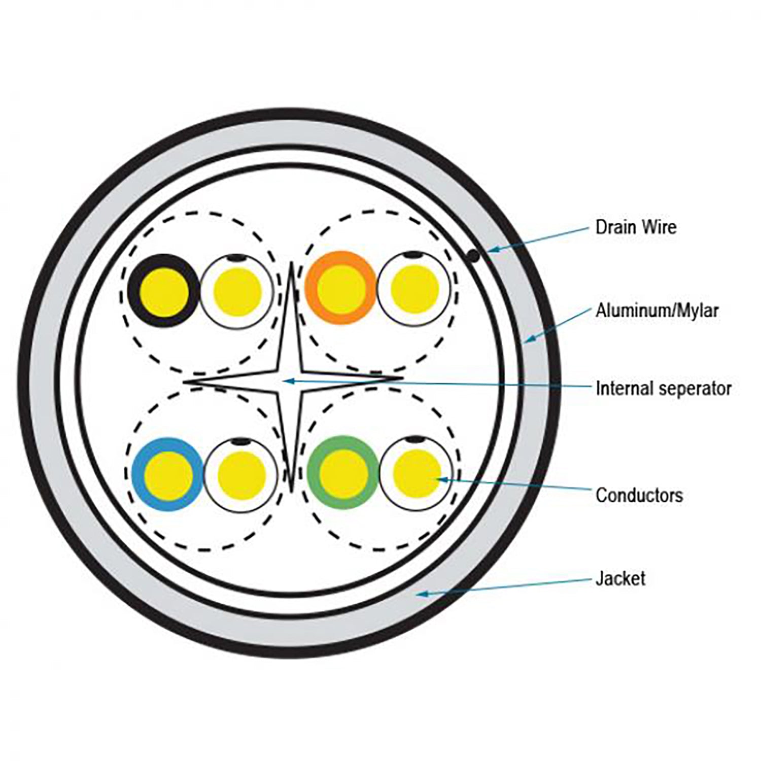 - Shielding: Aluminum Foil/Mylar Tape with Tinned Drain Wire (F/UTP)