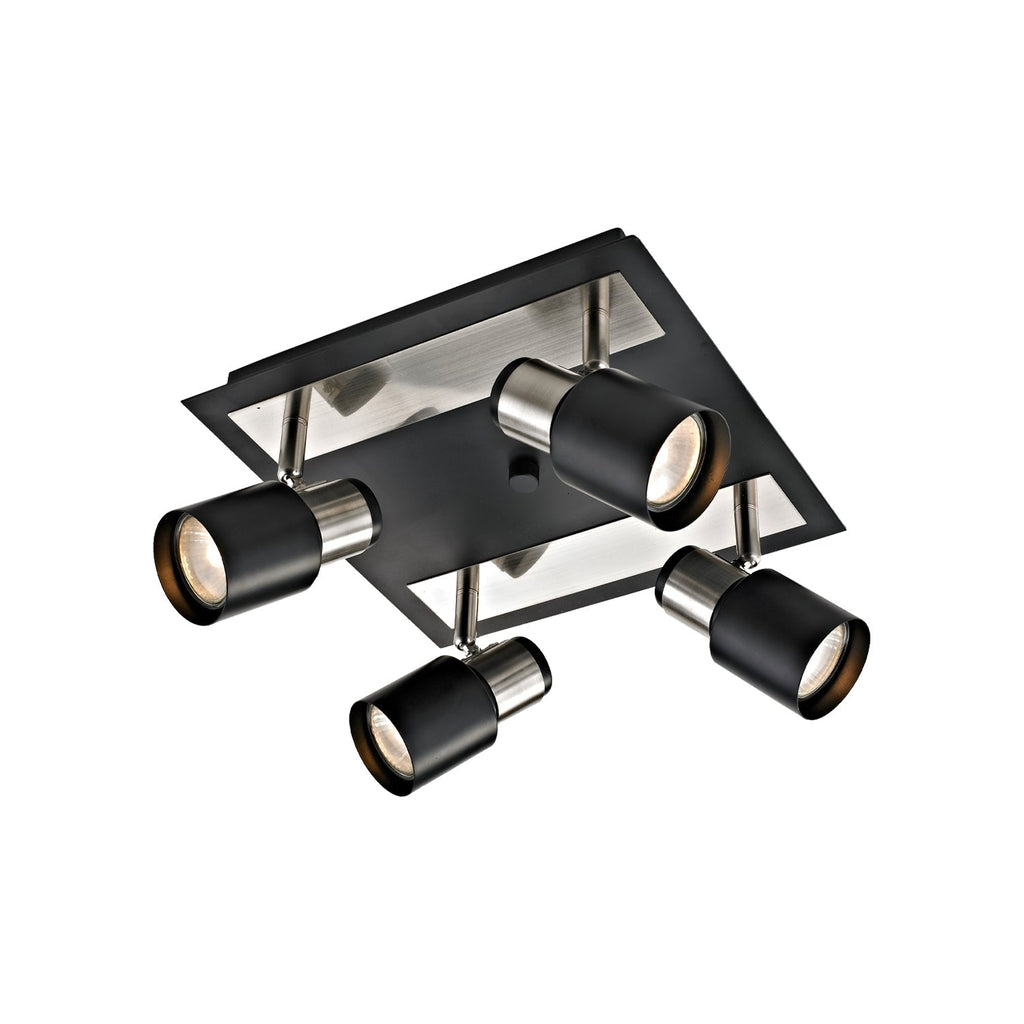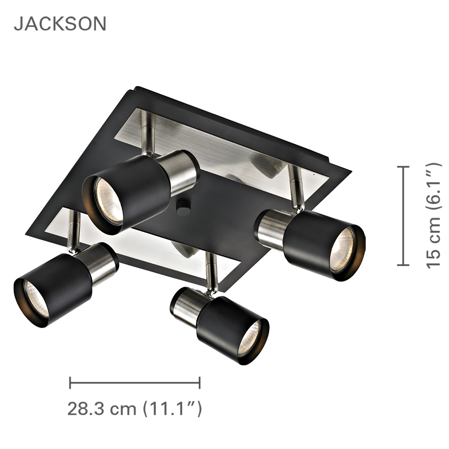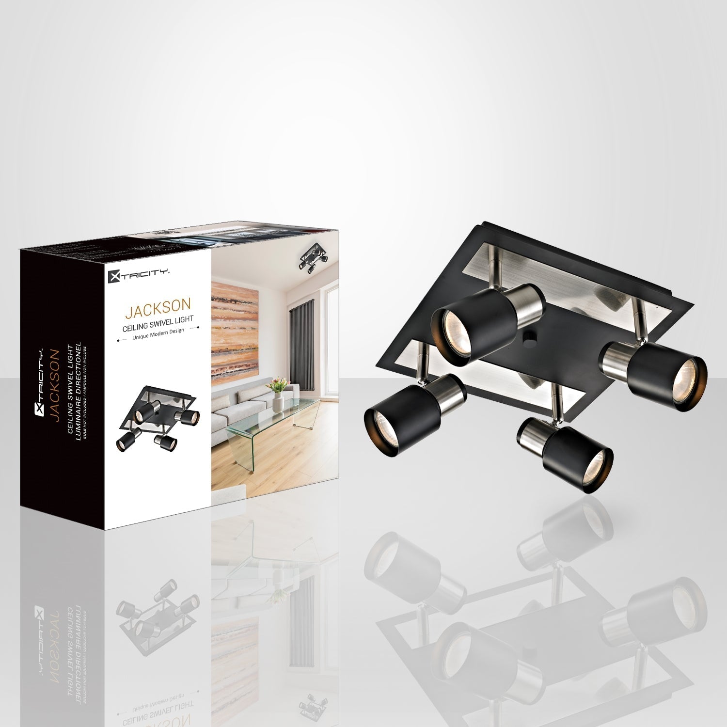 Illuminate your space with the 4-head ceiling light from the Jackson collection by Xtricity. The brushed nickel and matte black finish offers a modern and sophisticated aesthetic. The 4 required GU10 bulbs (not included), with a maximum power of 35W per base, create directional and stylish lighting. The contemporary design of the Jackson ceiling light fits any decor, adding chic brightness to your interior. Easy installation makes it a practical choice for an instant lighting update in your space, combining style and functionality with elegance.