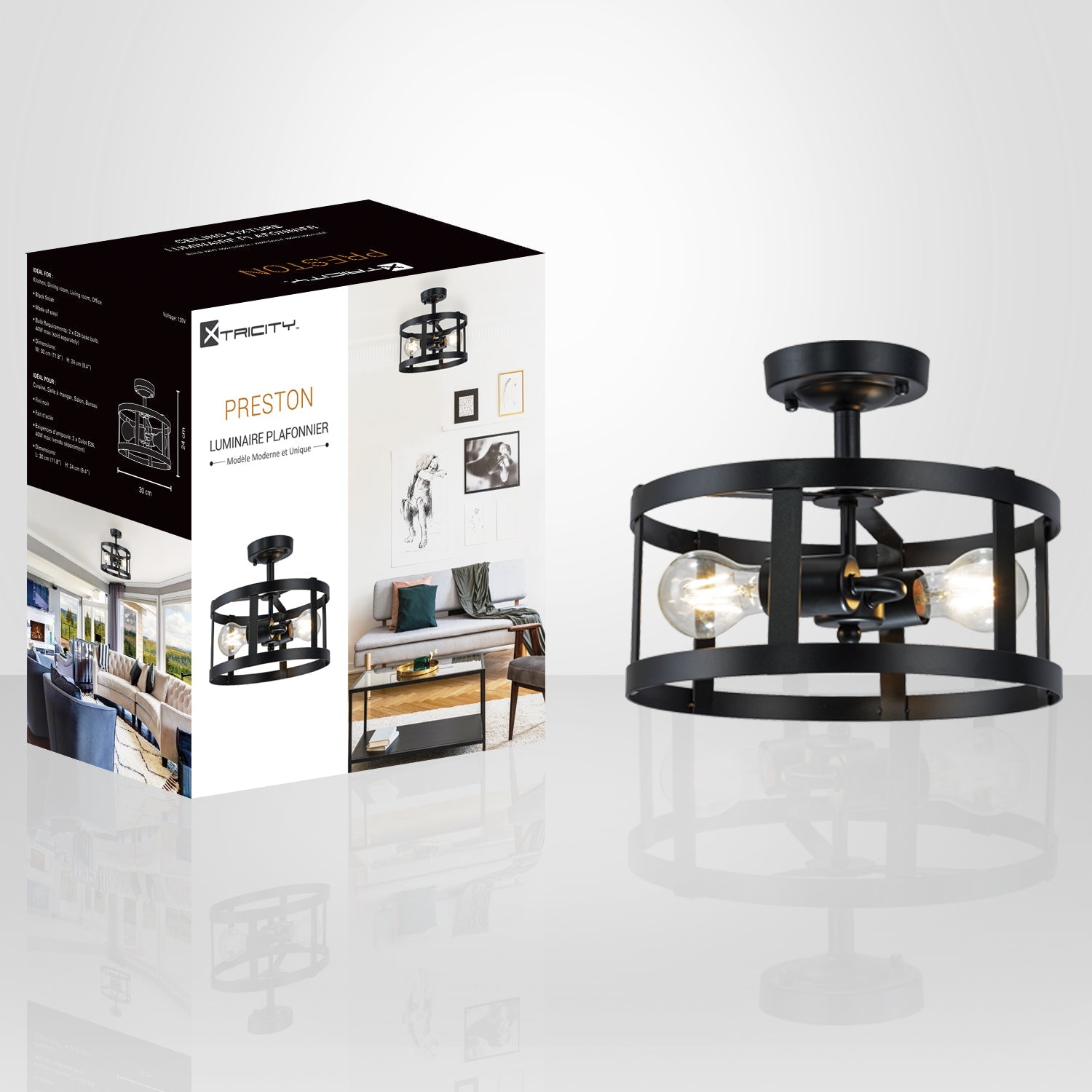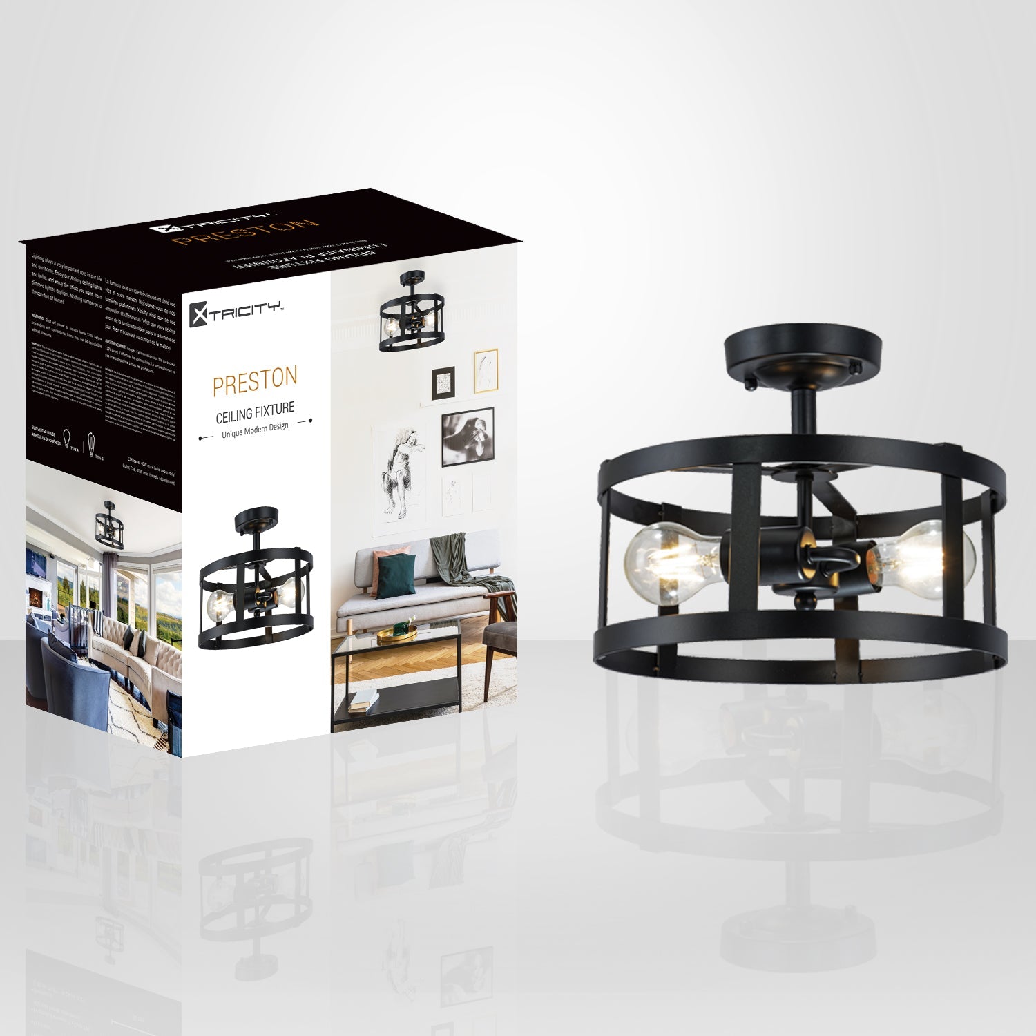 Illuminate your space with the Xtricity Decorative Ceiling Light from the Preston Collection. Ideal for kitchen, dining room, living room or office. The sleek black finish complements any decor. This ceiling light requires 2 E26 bulbs of 40W max each (not included). Operating at 120V, it offers versatile and modern lighting.