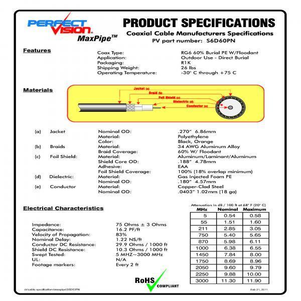 Perfect Vision Coaxial Cable RG6 Outdoor 3GHz 60% Braided Direct Burial Gel BlackItem: 98-CZRG6-OUT