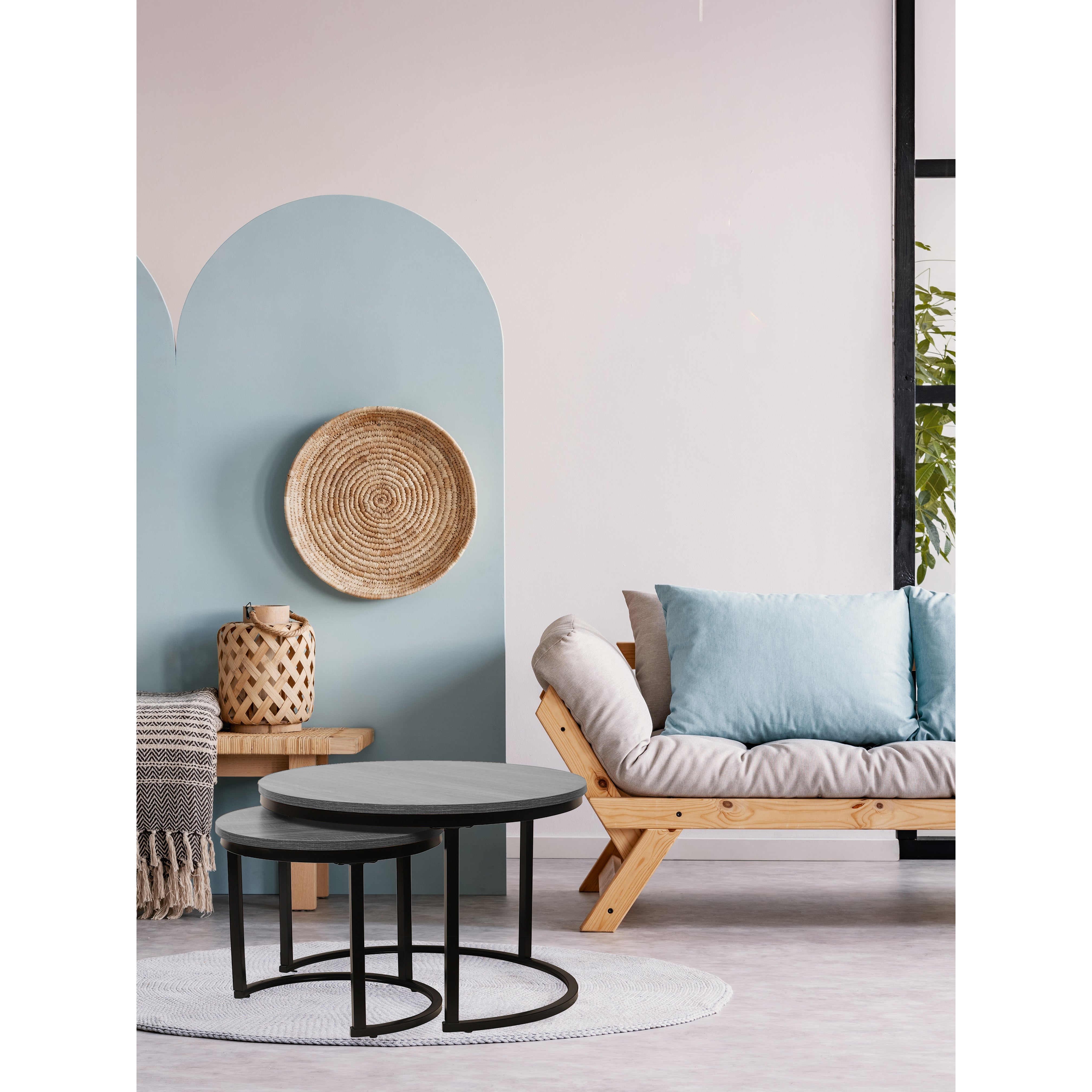 Transform your living room with the set of two Jessar round coffee tables from the Bali collection. This set includes a small table and a large table, providing a stylish and practical solution for your living space. The unique design combines sturdy metal table legs with a beautiful wood grain finish, creating a sophisticated and natural look. Easy to assemble, this set comes with all necessary hardware, allowing you to quickly enjoy your new furniture without hassle. Ideal for placing your books, cups of coffee or decorative items, these coffee tables are both functional and aesthetic, adding a touch of charm to your interior.