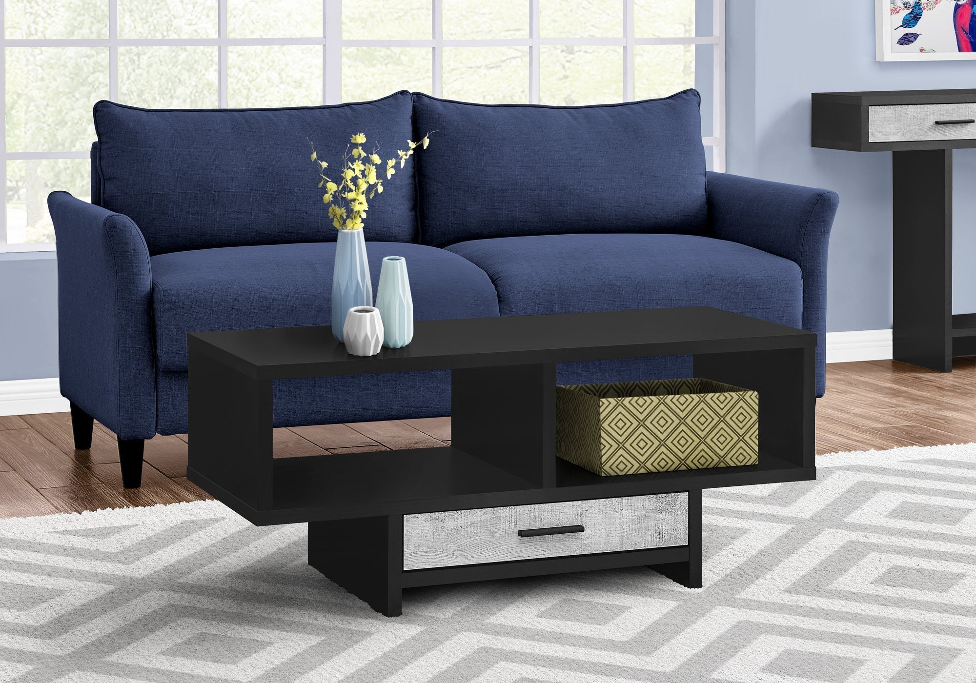 This unique, thick paneled modern style rectangular coffee table with abundant storage options, will give your living or office space that extra presence. Finished on all sides in a sleek black, it includes a warm rustic grey reclaimed wood-look contrasting drawer on smooth metal glides and accented with a black handle, keeping the clutter out of sight. The two spacious open cubbies can be used for creative display or to store books and magazines within easy reach. The spacious and smooth table-top has ample place to set down food and drinks whether working or entertaining. Assembly is required.