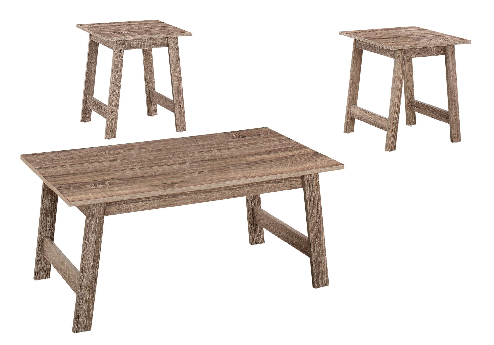 Bring some warmth and style to your living room, den, or family room with this modern 3 piece coffee table set in a rich dark taupe wood-look finish. The table tops are spacious enough to place books, a lamp, or decorative accessories, and the angular sturdy legs with a cross bar keep the look clean yet stylish. With a simple minimalist design, this rectangular coffee table with two matching square end tables is perfect for small spaces easily fitting into any décor style.