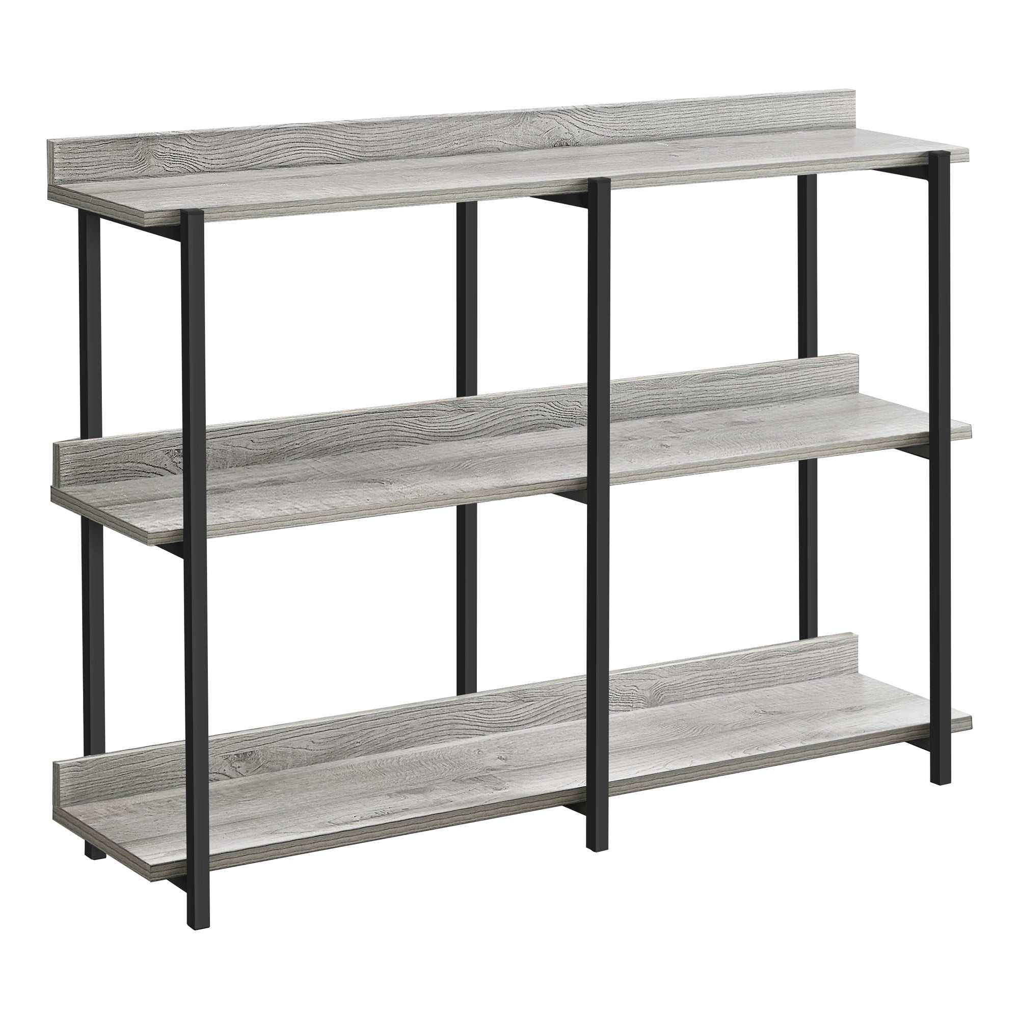 Proudly display prized possessions on this rectangular console table with 3-tier shelving. Underneath the long, narrow tabletop are shelves arranged on 2 levels. Distribute books, plants, and decorative items among the tabletop and shelves, which are in a grey laminate finish. The sturdy metal frame in a contrasting black finish features clean lines and right angles for a modern look. With its narrow profile and generous display space, this versatile accent table with storage is ideal for a hallway, an entryway, or behind a sofa in a living room.