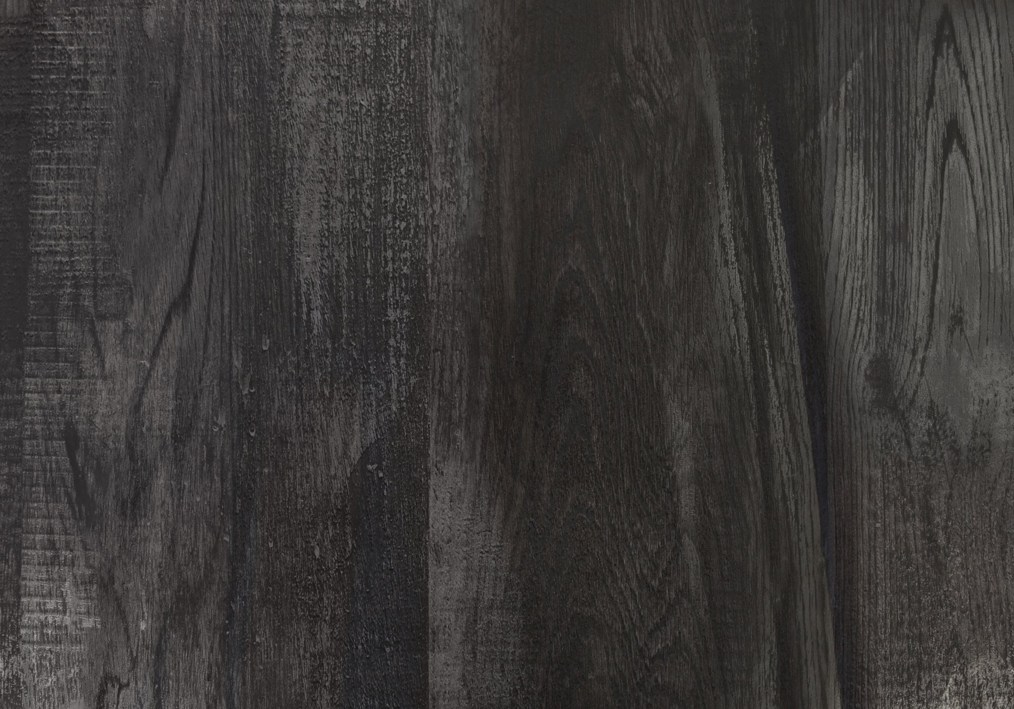 - Thick, rectangular tabletop in a black reclaimed wood-look finish is wide to offer a more generous surface