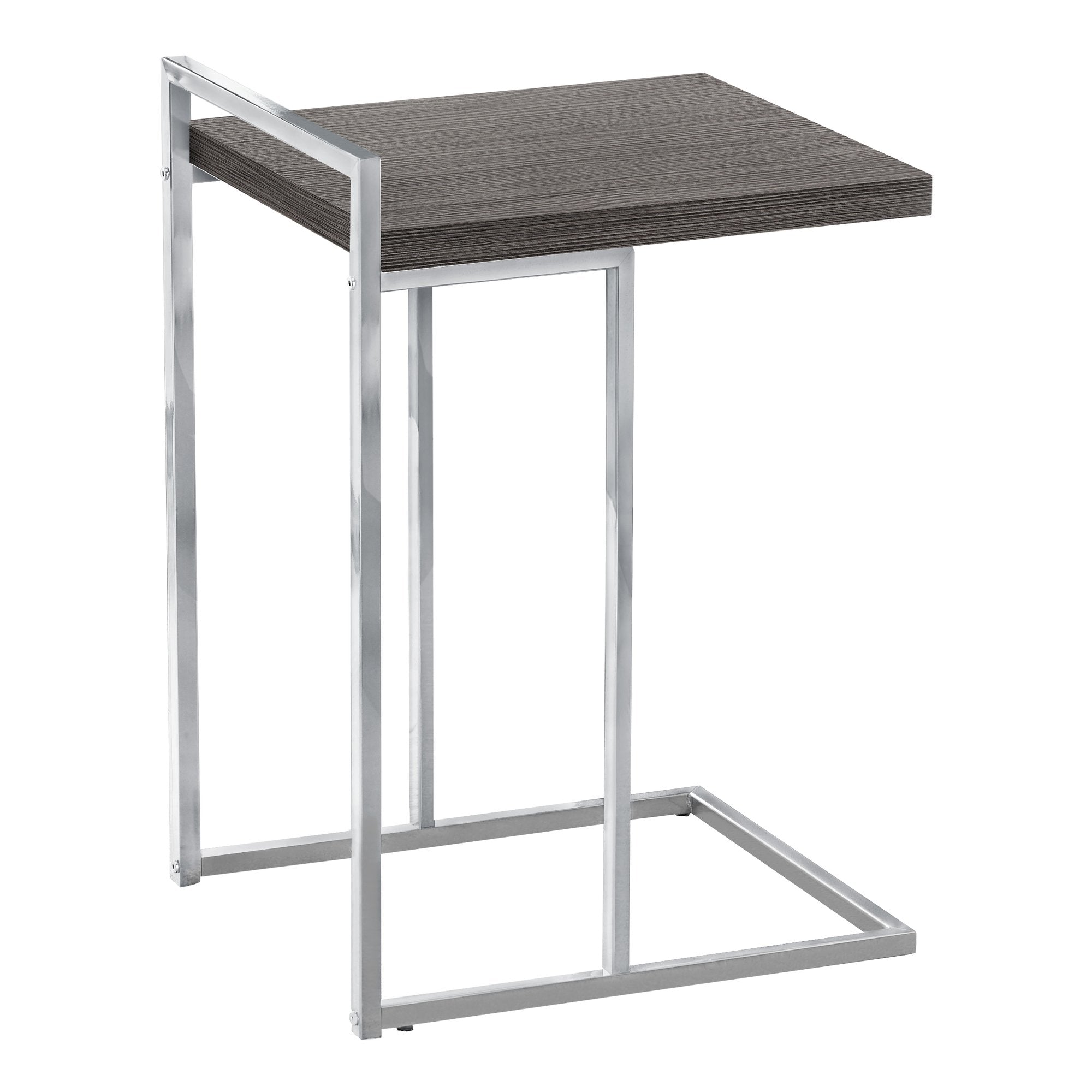 This C-shaped accent table brings something extra to the table. The thick-panel tabletop in a grey finish offers a wider surface than most standard-size C tables. More surface space gives you more opportunities to use this end table. It can multitask in a living room or bedroom as a snack table when you watch TV, a nightstand to place a mobile phone while you sleep, or even a small laptop table when you need to work. The chrome metal base slides under a sofa or bed to bring items closer to you and offers another convenient feature: The top of the frame extends over the tabletop to create a handle that makes it easier to lift and move this portable side table.
