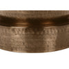 • This handcrafted 22-inch high metal tambour accent table sits atop a sturdy round base with a copper metal finish, featuring a subtle hammered look throughout for a boho-glam look in a living room or kitchen. bedroom.