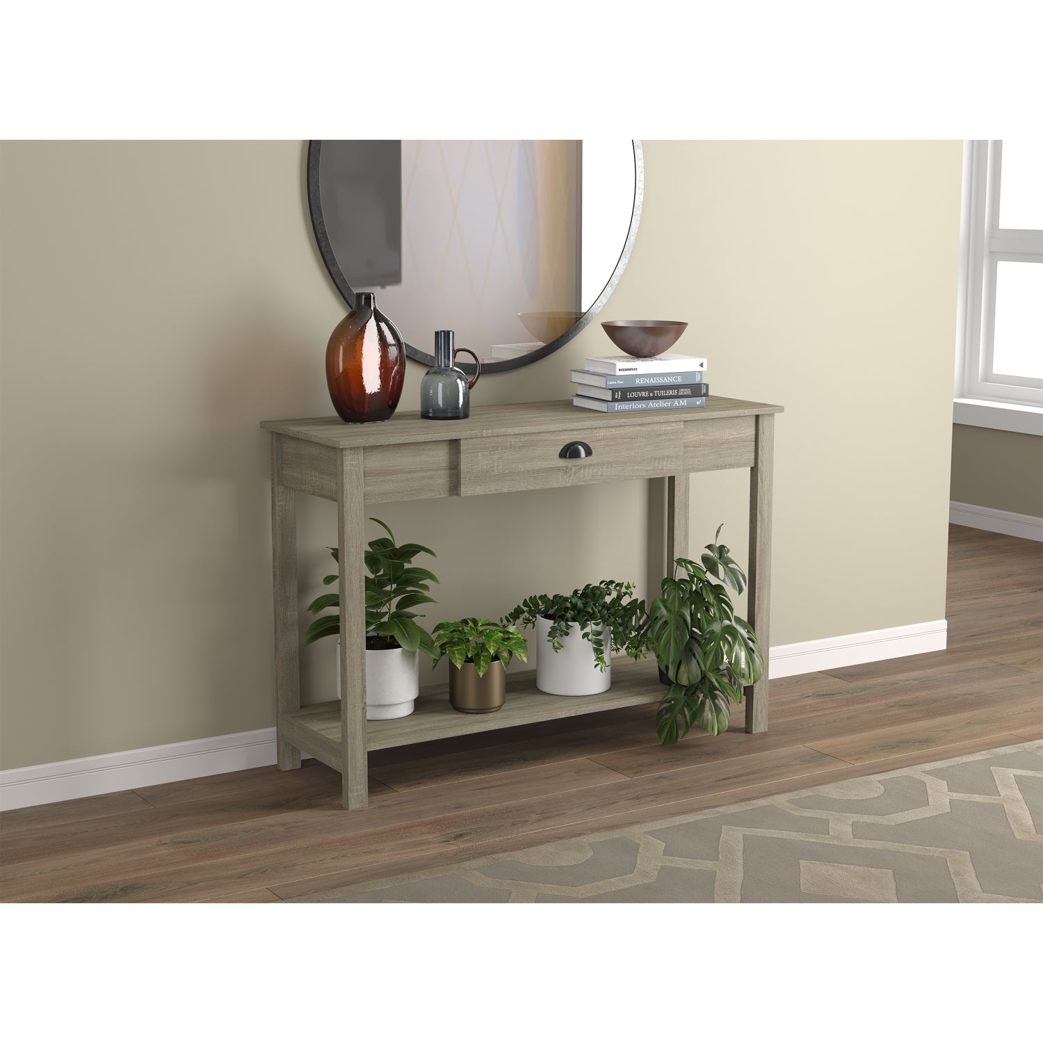 Safdie & Co Entryway Table Console Table Sofa Couch Table Accent Table - 47" Long Dark Taupe with 1 Drawer and Black Metal Handle for Living Room