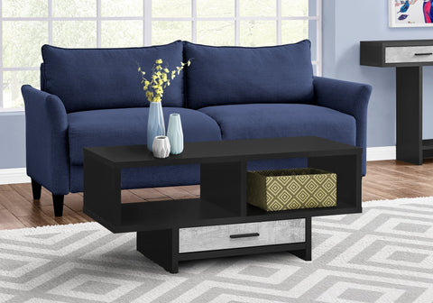 This unique, thick paneled modern style rectangular coffee table with abundant storage options, will give your living or office space that extra presence. Finished on all sides in a sleek black, it includes a warm rustic grey reclaimed wood-look contrasting drawer on smooth metal glides and accented with a black handle, keeping the clutter out of sight. The two spacious...
