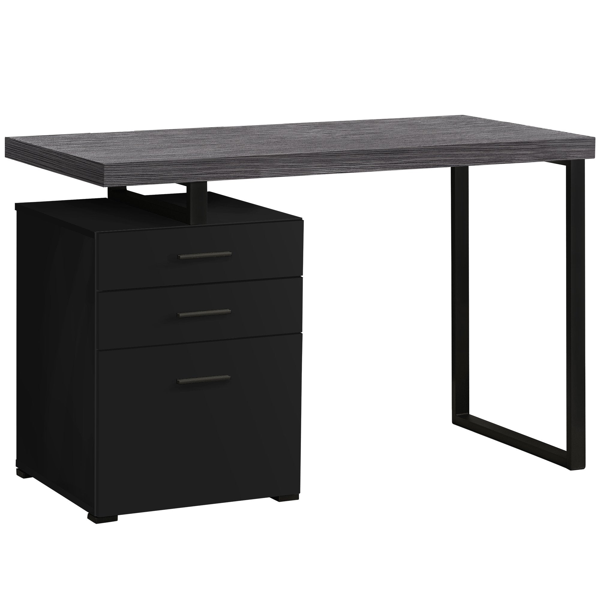Maximize your home office space and your productivity with this computer desk with 3 storage drawers. The thick-panel floating desktop provides room for the essentials you need to work and allows you to use the top of the drawer unit as an extra surface. Finished in a black laminate that contrasts the grey desktop, the drawer unit includes 2 small drawers and 1 large drawer with a bar for hanging files and offers space for items you want to keep off the work surface. The drawer unit is reversible and can be installed on the left or right side according to your preference. Supporting the desk is a metal leg in a black finish with a modern, stylish U shape.