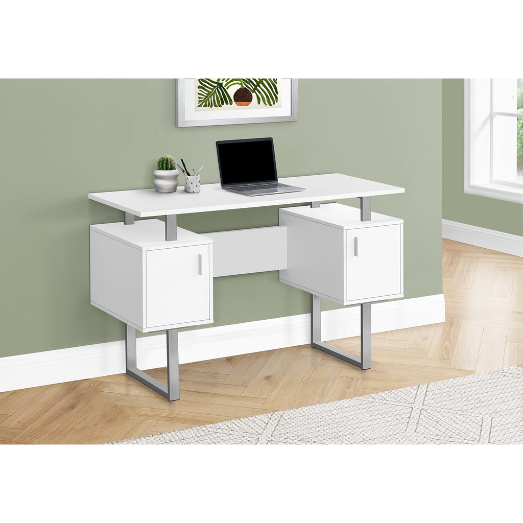 Optimize your workspace with this contemporary Monarch Specialties medium-sized computer desk. Featuring spacious storage cabinets for your essential supplies, this desk has an elegant white finish on all sides, including inside the closed cabinets. This gives you maximum flexibility for placement in any room. Each cabinet features an adjustable shelf, giving you ample space to organize your office equipment or important documents, while keeping them within easy reach and out of sight. U-shaped, silver matte metal legs provide solid support for this contemporary version of a mid-century desk. Full assembly instructions included.