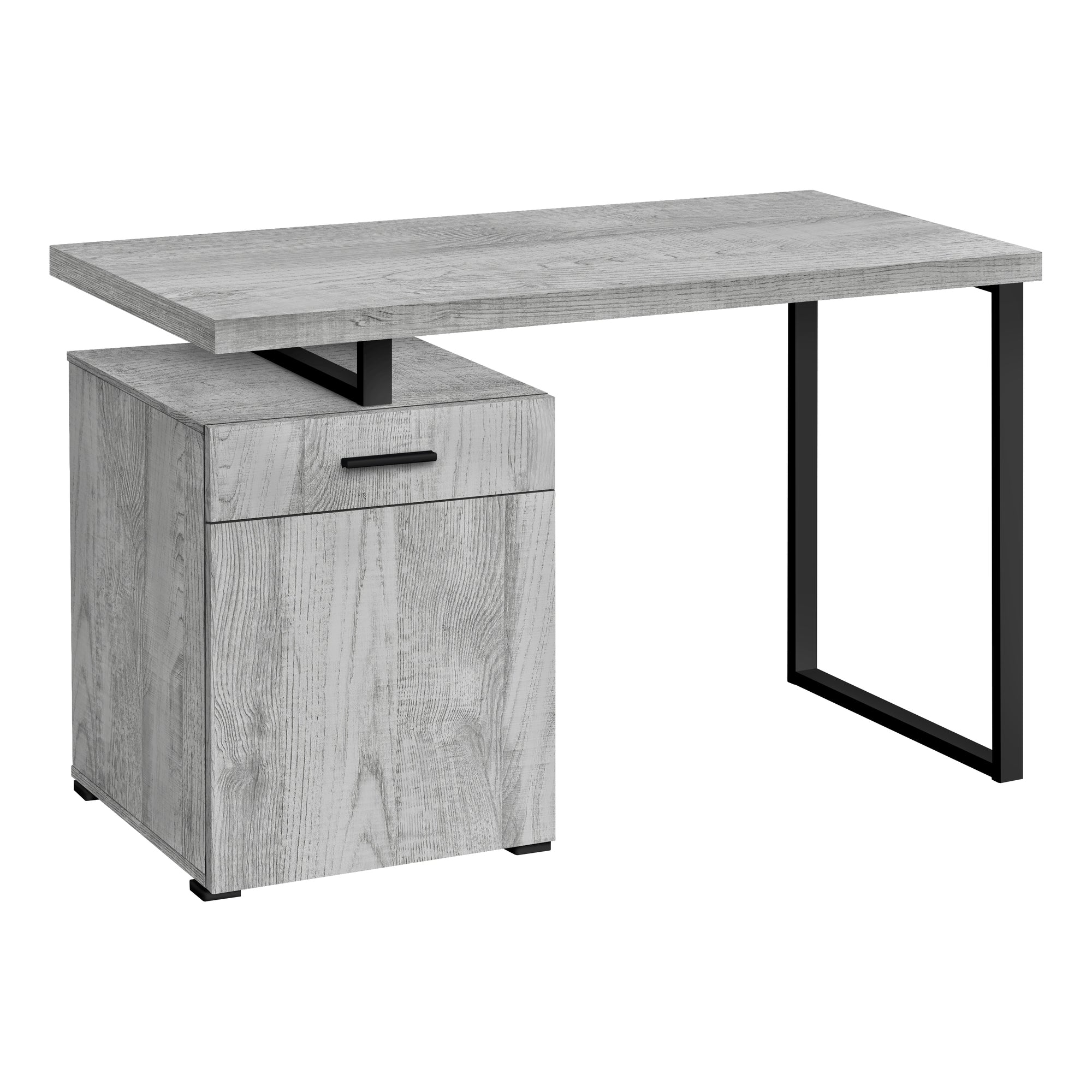 Maximize your home office space and your productivity with this stylish computer desk with storage. The thick-panel floating desktop provides room for the essentials you need to work and allows you to use the top of the drawer unit as an extra surface. Finished in the same grey wood-look laminate as the desktop, the drawer unit includes 1 drawer and 1 large storage beneath offering lots of space for items you want to keep off the work surface. The drawer unit is reversible and can be installed on the left or right side according to your preference. Supporting the desk is a metal U shaped leg in a contrasting black finish completing the modern look.
