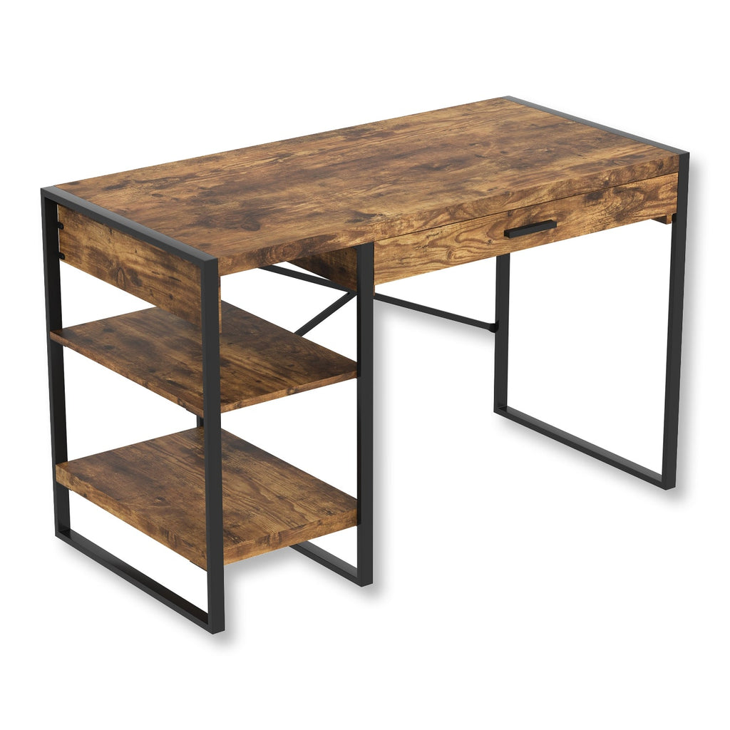 Elevate your office, bedroom, living room or dorm room with this contemporary computer desk. Its sturdy metal frame and x-shaped accents give it an industrial feel that is complemented by the deskメs rustic wood-look surfaces. Made with high-quality MDF and complete with a spacious desk top, a large drawer and two open shelves, this desk offers style, function, durability, and is sure to encourage productivity for years to come.
