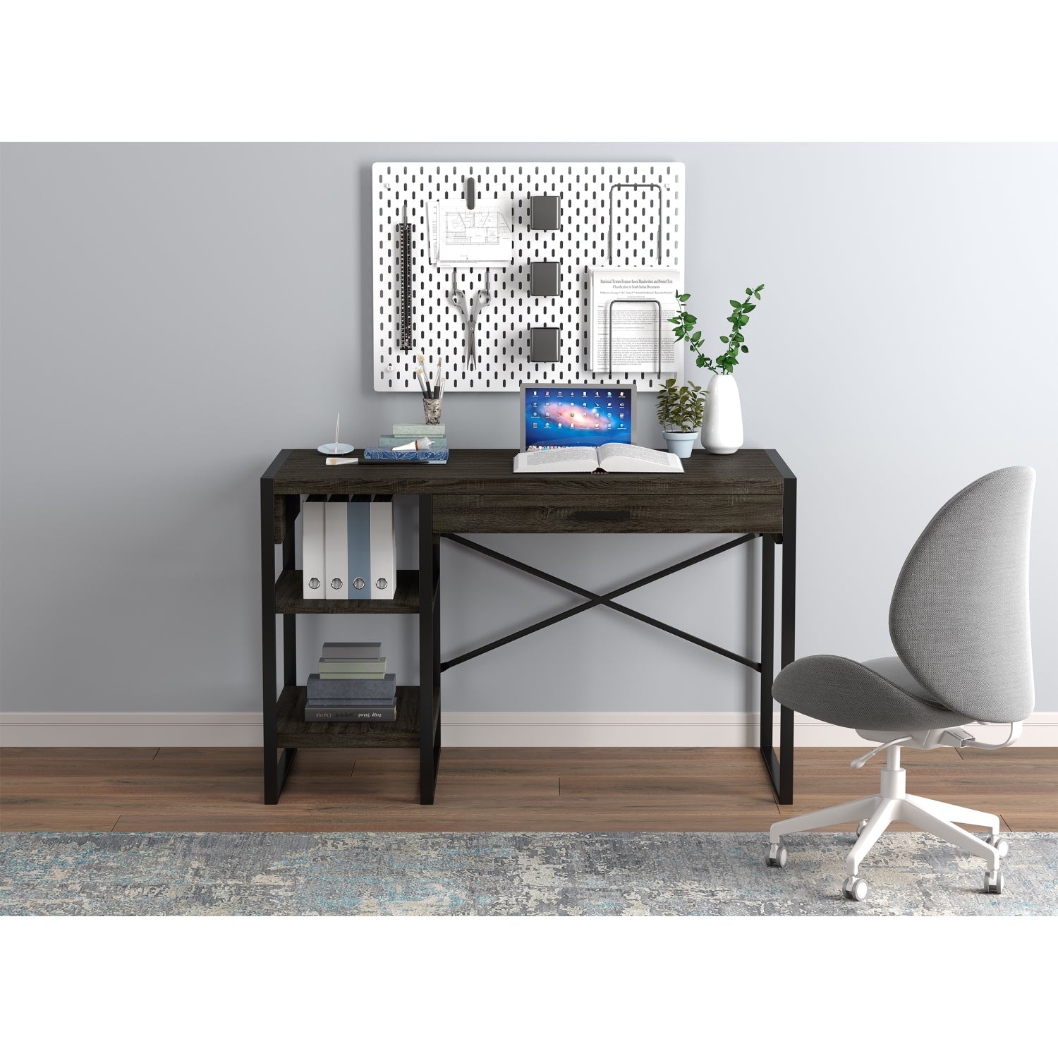 Elevate your office, bedroom, living room or dorm room with this contemporary computer desk. Its sturdy metal frame and x-shaped accents give it an industrial feel that is complemented by the deskメs rustic wood-look surfaces. Made with high-quality MDF and complete with a spacious desk top, a large drawer and two open shelves, this desk offers style, function, durability, and is sure to encourage productivity for years to come.