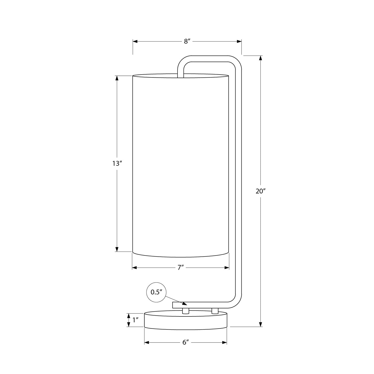 - Assembled dimensions: 8" W x 8" D x 20" H; base: 6" W x 6" D x 1" H; shade: 7" W x 7" D x 13" H.