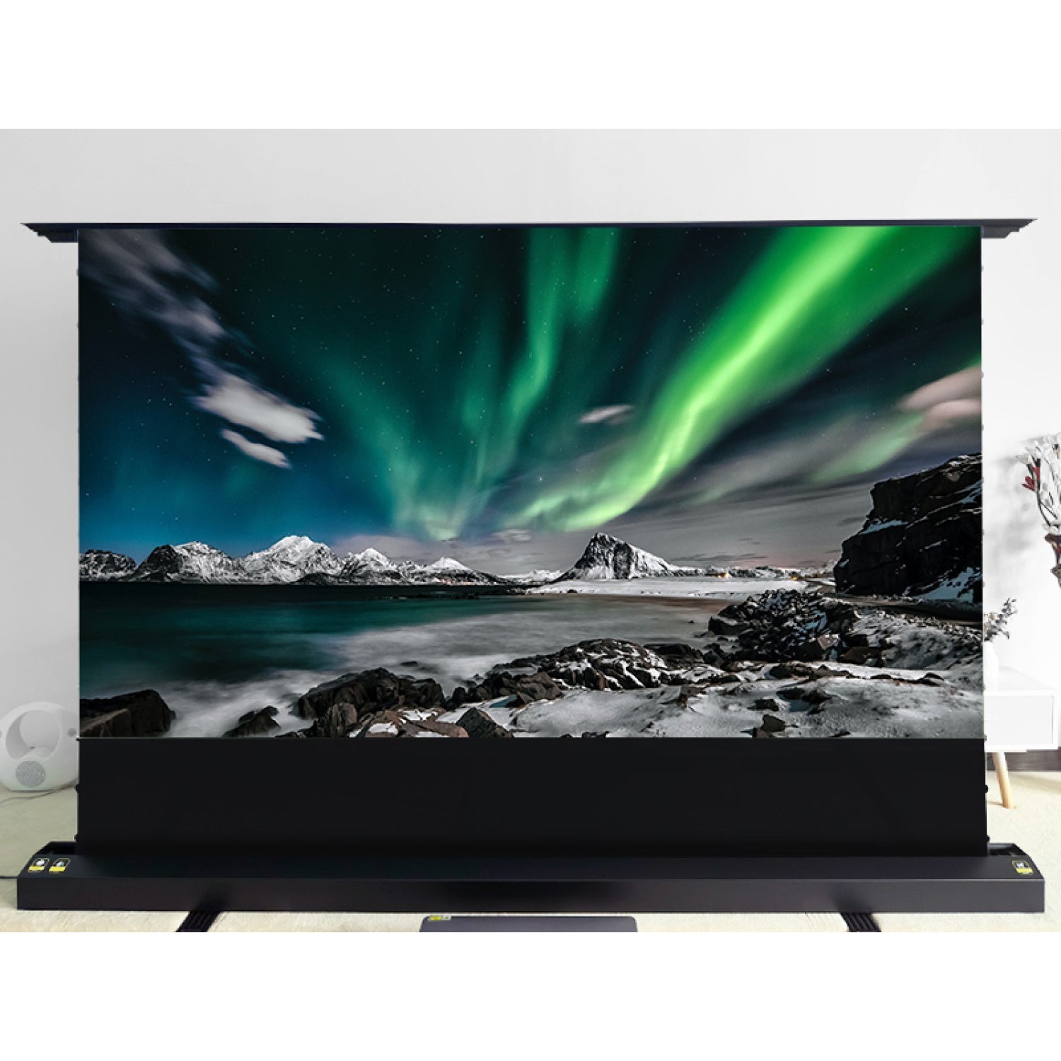 - Aurora 8K Ultra Short Throw Motorized Tab-Tension ALR Display: Features a floor-rising design, allowing it to blend seamlessly into your living space. With the press of a button, the screen emerges elegantly from its casing, ready to transform any room into a captivating home cinema. When not in use, it retracts effortlessly, maximizing floor space and maintaining a clutter-free environment. Which makes this projection screen the ultimate solution for those with limited space and looking for unlimited viewing capabilities