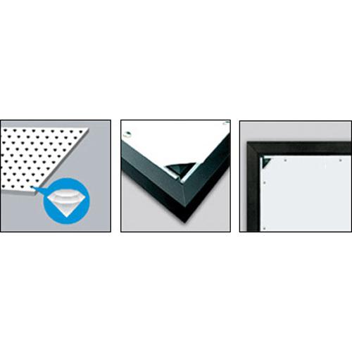 The multiply vinyl projection screen material is kept under high tension by a unique means found only in Antra products. Steel bars are inserted into a looped seem that runs round the edge of the material. The bars are then fixed into the aluminium frame, causing the material to be pulled evenly from all four sides.