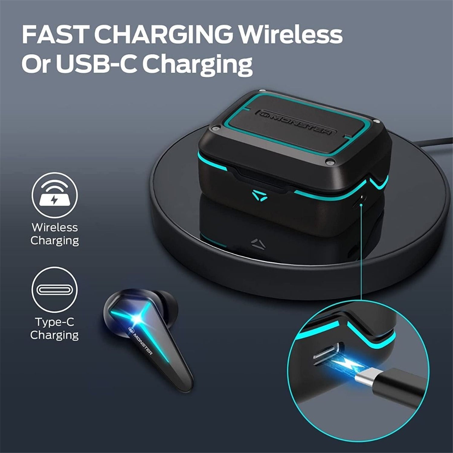 .Bluetooth Headphones: Fast Wireless Charging: The USB-C charging case supports wireless charging. It lasts for over 5 hours of playtime on a full charge, with an additional 24 hours of use in the compact charging case. Monster Bluetooth Headphones are resistant to fresh water mist and splashes, but not partial or full immersion. Perfect for travel, fitness, etc.