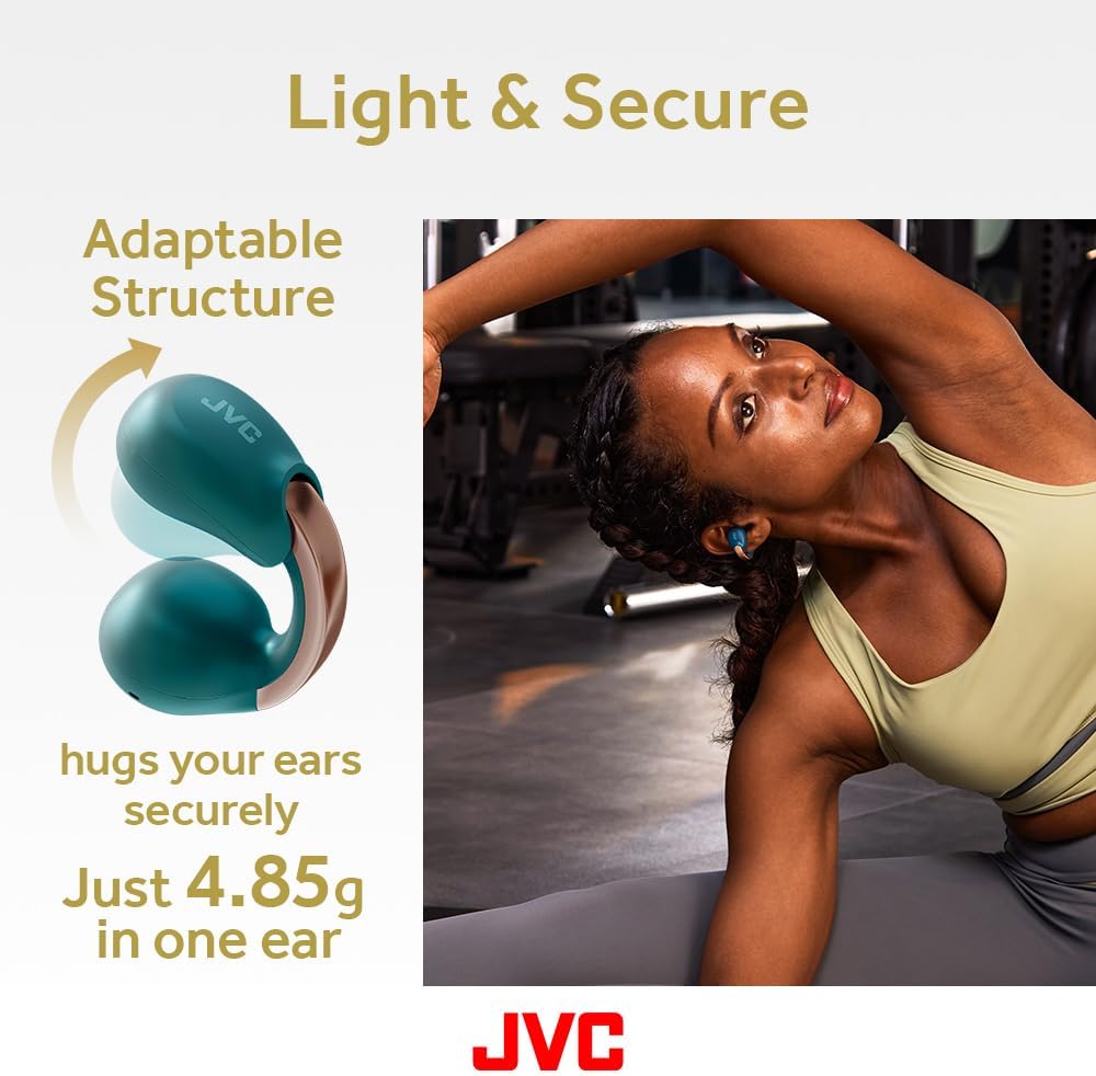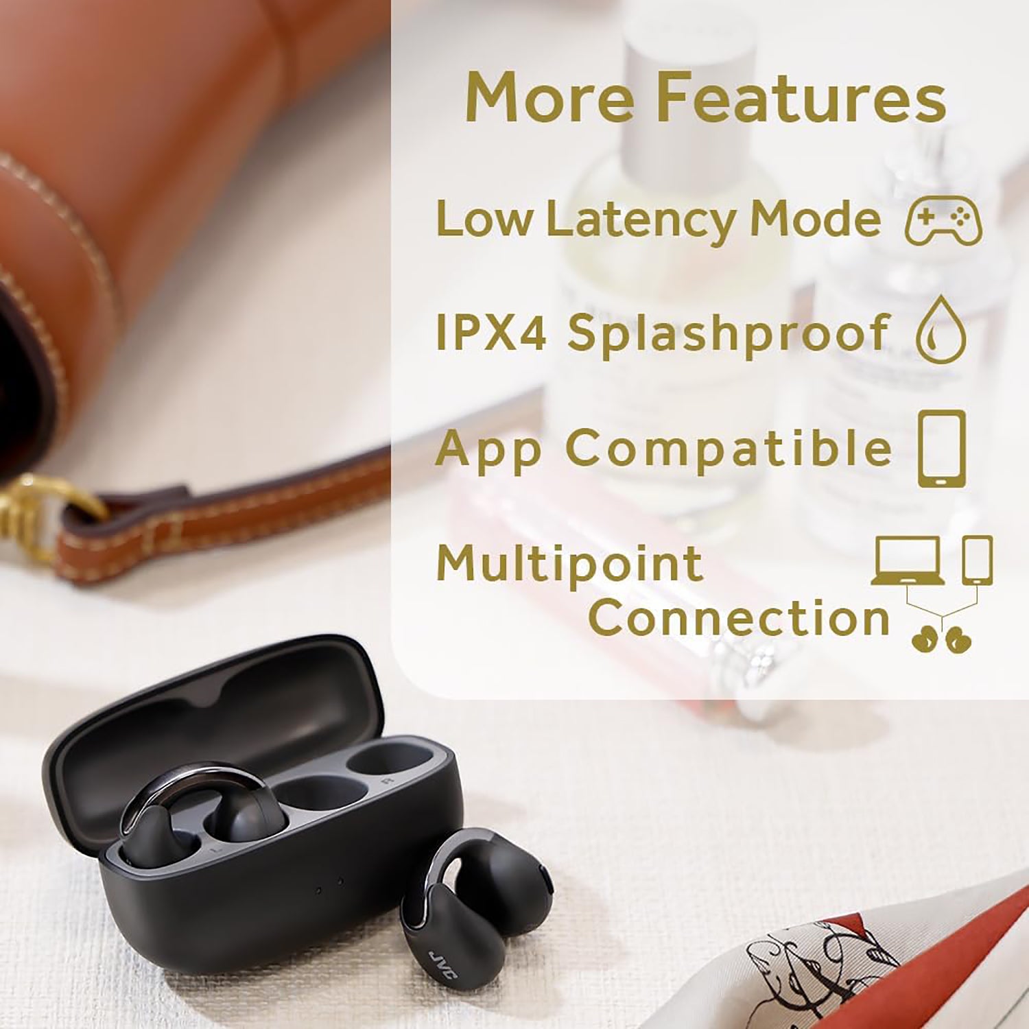 Discover the JVC Nearphones, open-back wireless headphones that let you listen to your music while remaining aware of your surroundings. Inspired by jewelry, their lightweight and stylish earcuff design ensures comfortable wear all day long, ideal for an active lifestyle. Available in 5 trendy colors, these headphones have a compact charging case that matches your style. Their secure fit ensures optimal stability, even during intense workouts. With a battery life of 24 hours, multipoint connectivity and low latency mode, these headphones are perfect for teleworking and clear calls thanks to their built-in microphone. Enjoy an immersive sound experience, without ear occlusion, for natural and fluid listening.