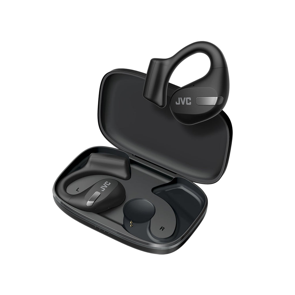 Experience ultimate sound immersion with JVC wireless headphones. Enjoy deep bass and enhanced performance, tailored to your environment with three sound modes. Lightweight and comfortable, these headphones offer up to 9.5 hours of listening time and 38 hours with the charging case. The hooks provide a secure hold, ideal for active use. Answer calls with ease with dual built-in microphones and noise reduction. IPX4 water resistant, they are perfect for use on the move. Personalize your experience with the dedicated app and take advantage of low latency mode for lag-free listening.
