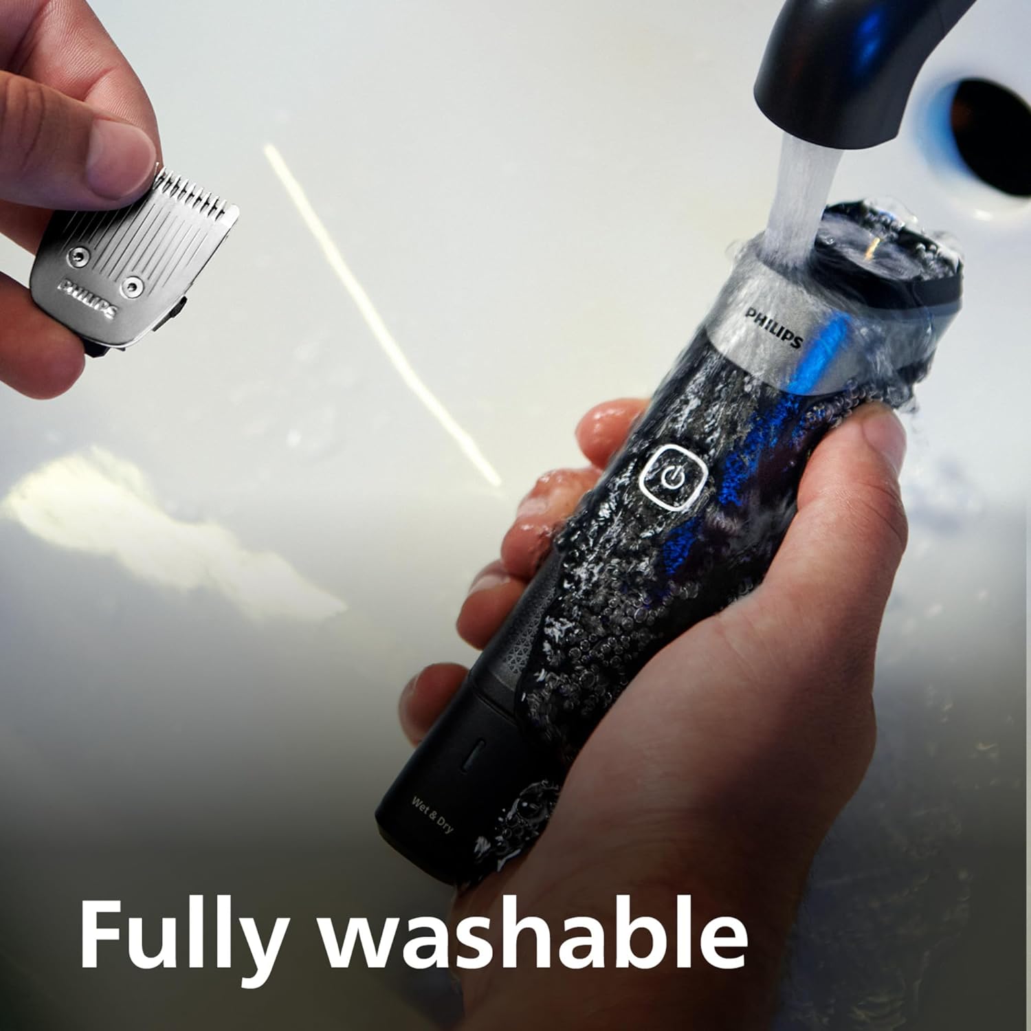 Discover the ultimate versatility with the Philips 5000 Series All-in-One Trimmer. Its 20 tools and accessories cover all your grooming needs, offering 9 length settings from 0.5 to 16 mm for varied beard styles. Self-sharpening stainless steel blades ensure long-lasting performance without requiring oil. Easy to clean under the tap, this trimmer is also fully washable. With up to 170 minutes of battery life and a 5-minute quick charge, it ensures maximum power at all times. Enjoy a premium all-in-one trimmer with the Philips 5000 Series.