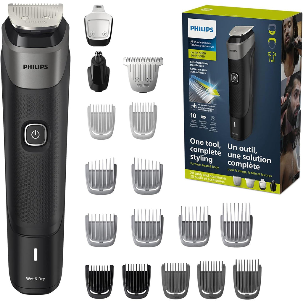 - Includes 1 x Multigroom Series 5000, 20 pieces: face, head and body, soft pouch, cleaning brush, USB-A charging cable (adapter not included)