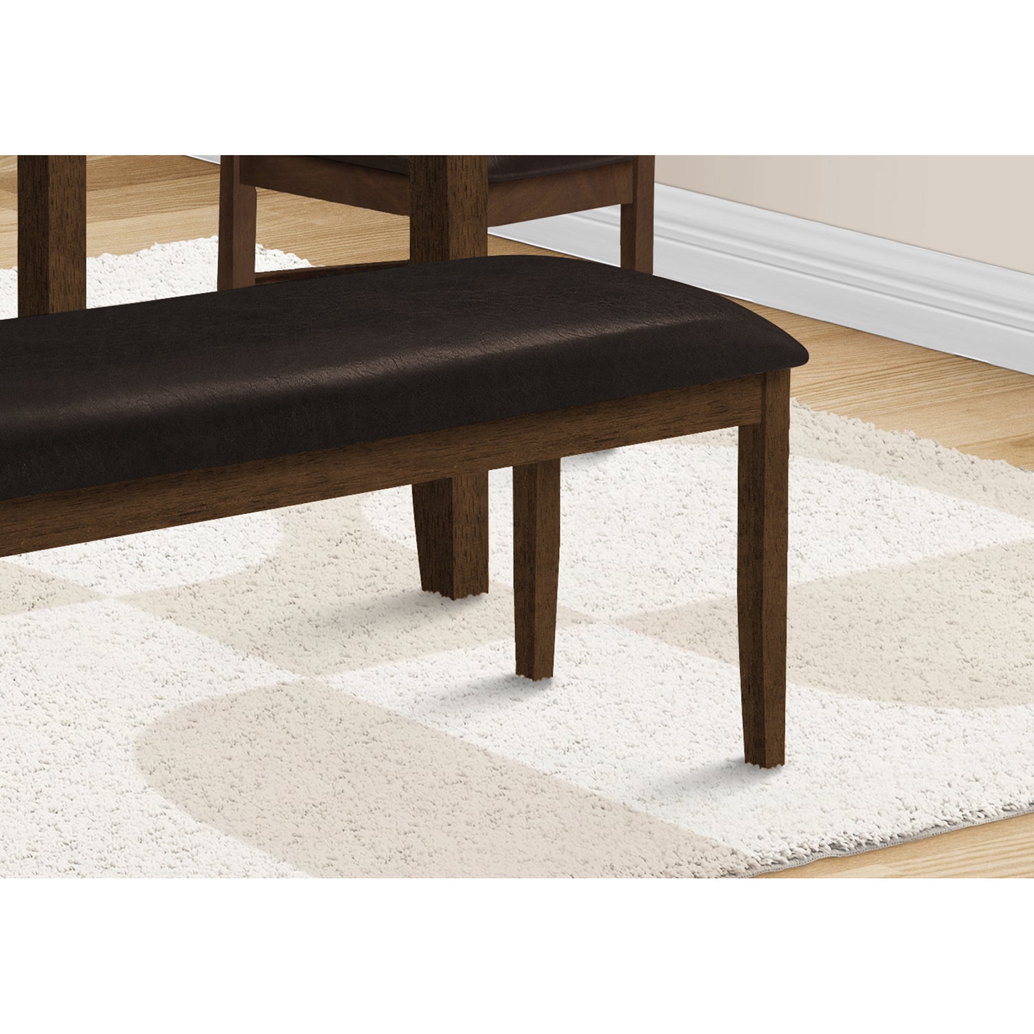 Discover the elegance of the 48" Rectangular Upholstered Bench from Monarch Specialties. This versatile bench combines a solid wood frame with a warm brown finish and dark brown faux leather upholstery. Perfect for the dining room, entryway or hallway , this transitional design fits any decor style. Easy assembly, exceptional durability, and a 2-year limited warranty against manufacturer defects make this bench a sure value. Transform your space with style and comfort today .