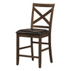 Add a touch of style and function to your dining room or kitchen with this set of two counter height dining chairs. Finished in dark walnut and upholstered in brown leather-look fabric, these chairs offer a transitional design that is perfect for modern or classic spaces. Foam padding and a padded seat provide optimal comfort, ideal for casual family meals. The sturdy construction with solid wood legs and a cross backrest ensures durability and stability, complemented by a footrest for added support. Easy to assemble with the included illustrated instructions, these chairs are perfect for pairing with a matching counter height dining table (sold separately).