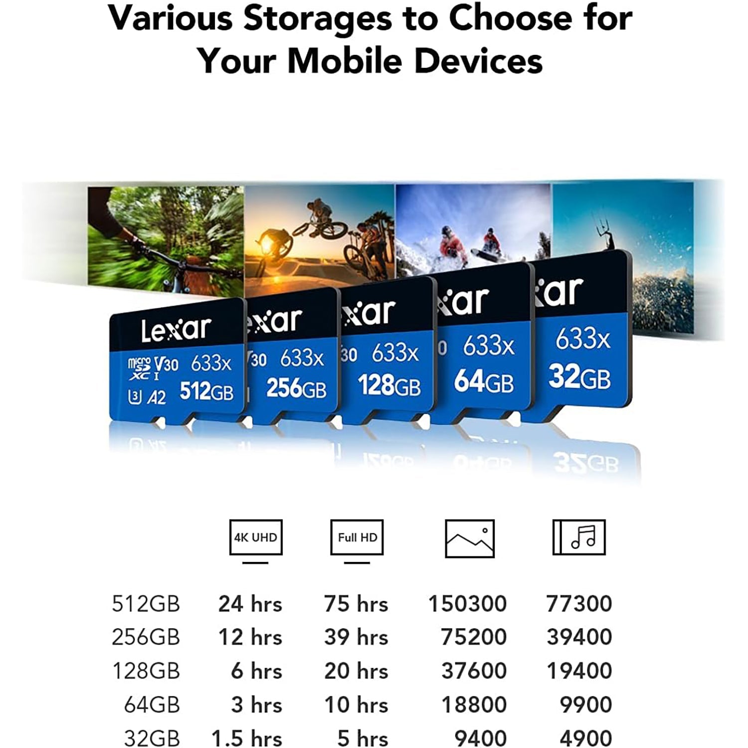 Discover Lexar's high-performance 633x UHS-I microSDHC cards designed for your mobile devices. Quickly capture, playback and transfer Full HD, 3D and 4K video with speeds up to 95MB/s. Whether you're using your smartphone, tablet or action camera, these Class 10 cards deliver the speed and space needed for your on-the-go adventures. Take advantage of the included SD adapter for easy transfer between your devices.