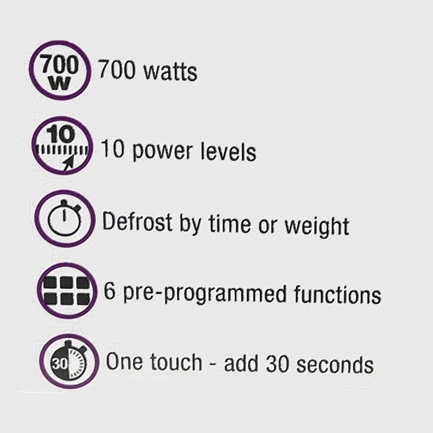 6 Pre-Programmed Functions: Includes specific settings for potatoes, popcorn, pizza, beverage, frozen food and reheat, making meal preparation easier.