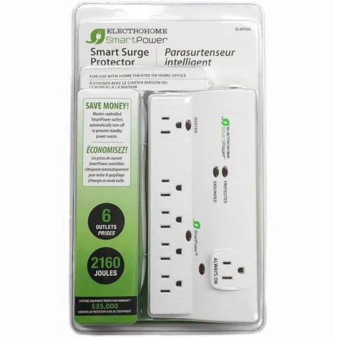 Maximize the protection and energy efficiency of your devices with the ElectroHome SmartPower surge protector. With its advanced energy-saving technology, it automatically cuts off power to devices on standby, reducing your electricity consumption. With 2160 joules of surge protection, this model is ideal for home theaters and home offices. Its 6-foot 14 AWG cord offers great installation flexibility, while the...