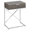 If you are looking to add a simple contemporary touch to your space, start with this accessible multi-functional accent side table. The spacious rectangular table top is constructed from solid MDF material and finished in a chic laminated dark taupe wood-grain for a modern look. The large storage drawer on metal glides is accented with a simple metal handle on top. A minimalist style chrome metal base with an X design frames the table keeping things light and airy. Whether you use this fashionable table as a nightstand in a modern bedroom space or as an end table, it adds instant style to any room!